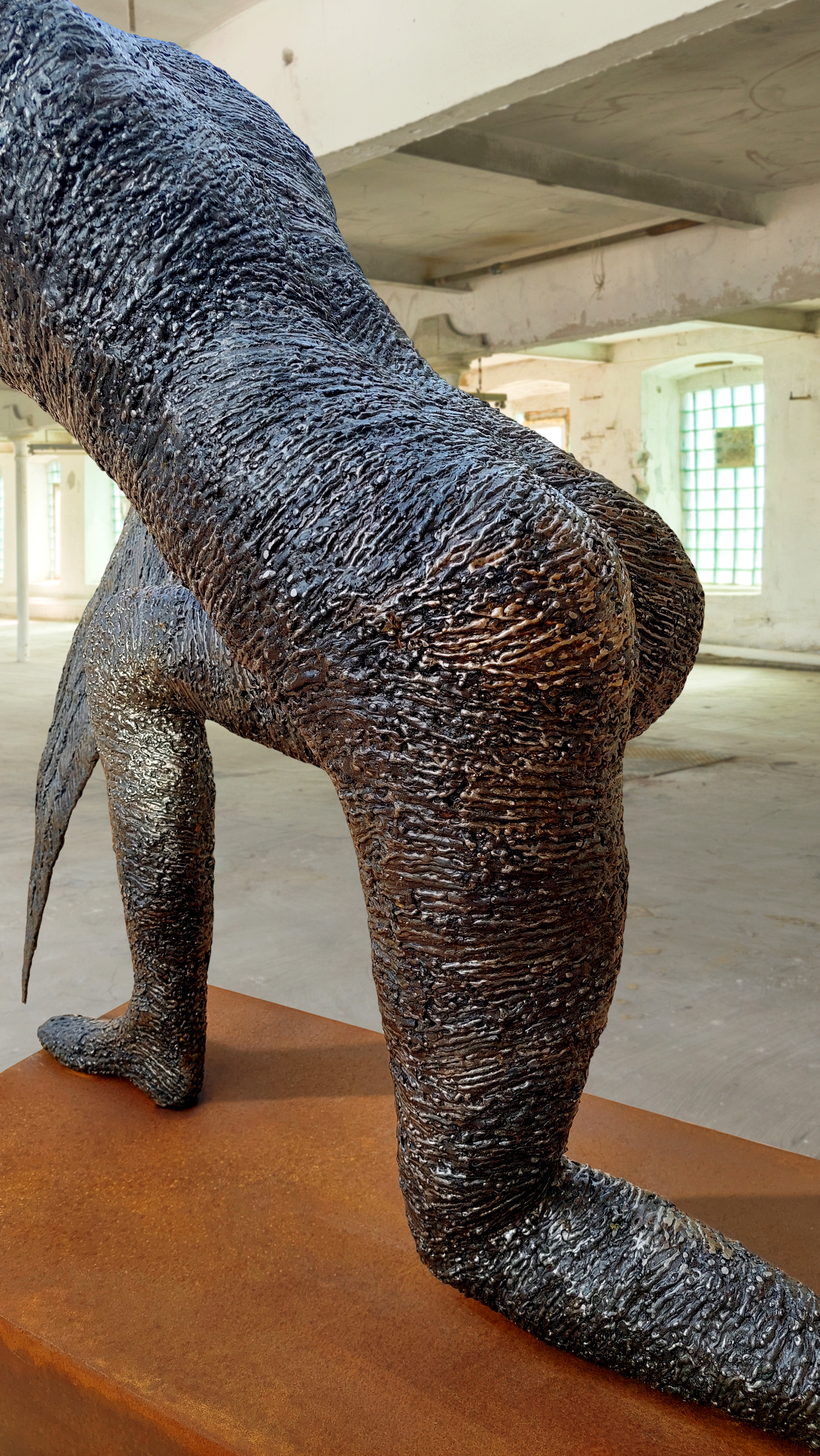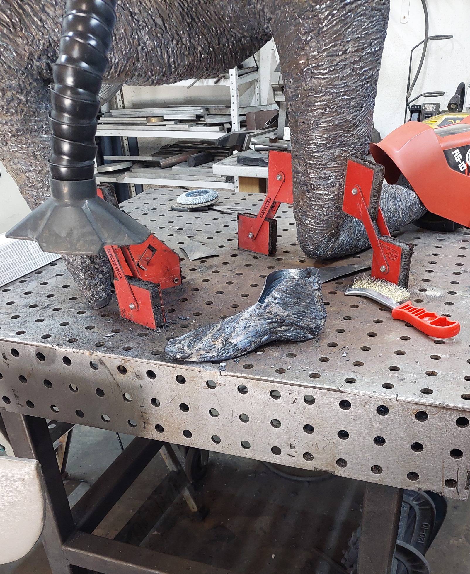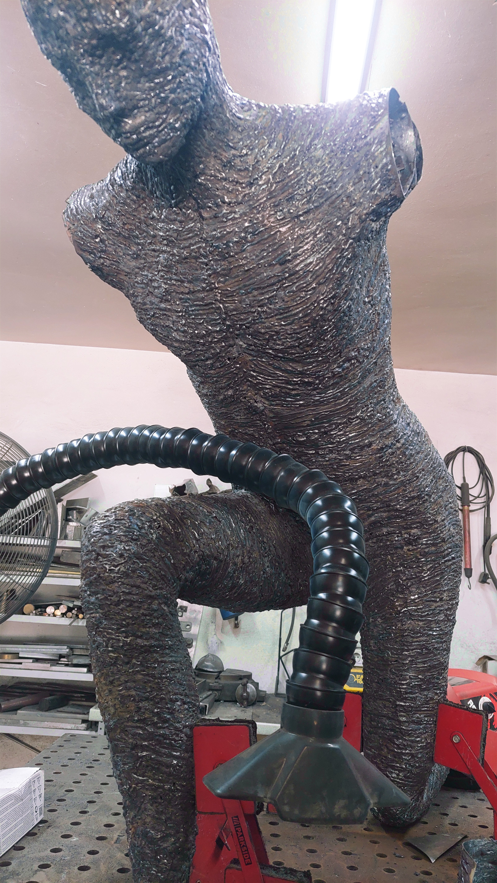 As the sculpture evolved and the form was ready to accept the final part to its build, a surface of arc weld was layered over the steel to produce the undulating patination... this whole process took many months to make (please see the build photos).