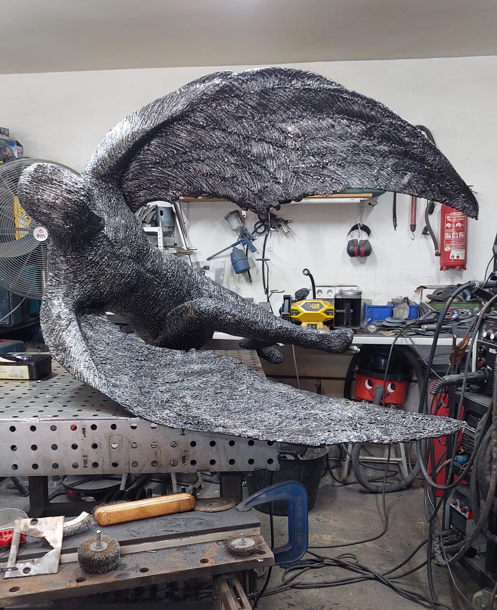 An armature of hand shaped steel plate sections, constructed over the anvil and welded together were used to form the body. The wings were made using the English Wheel, each section hand cut and given its curvature, then welded onto an armature of steel rods.