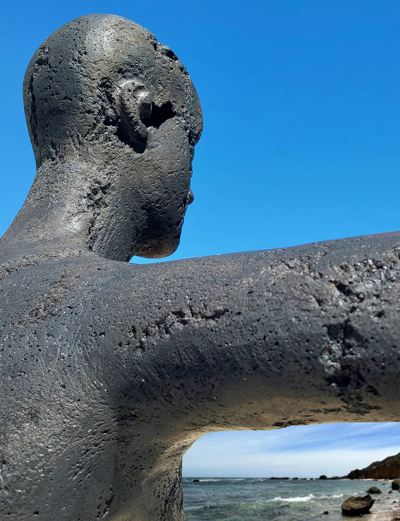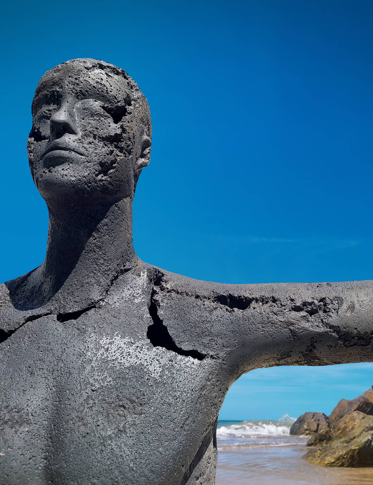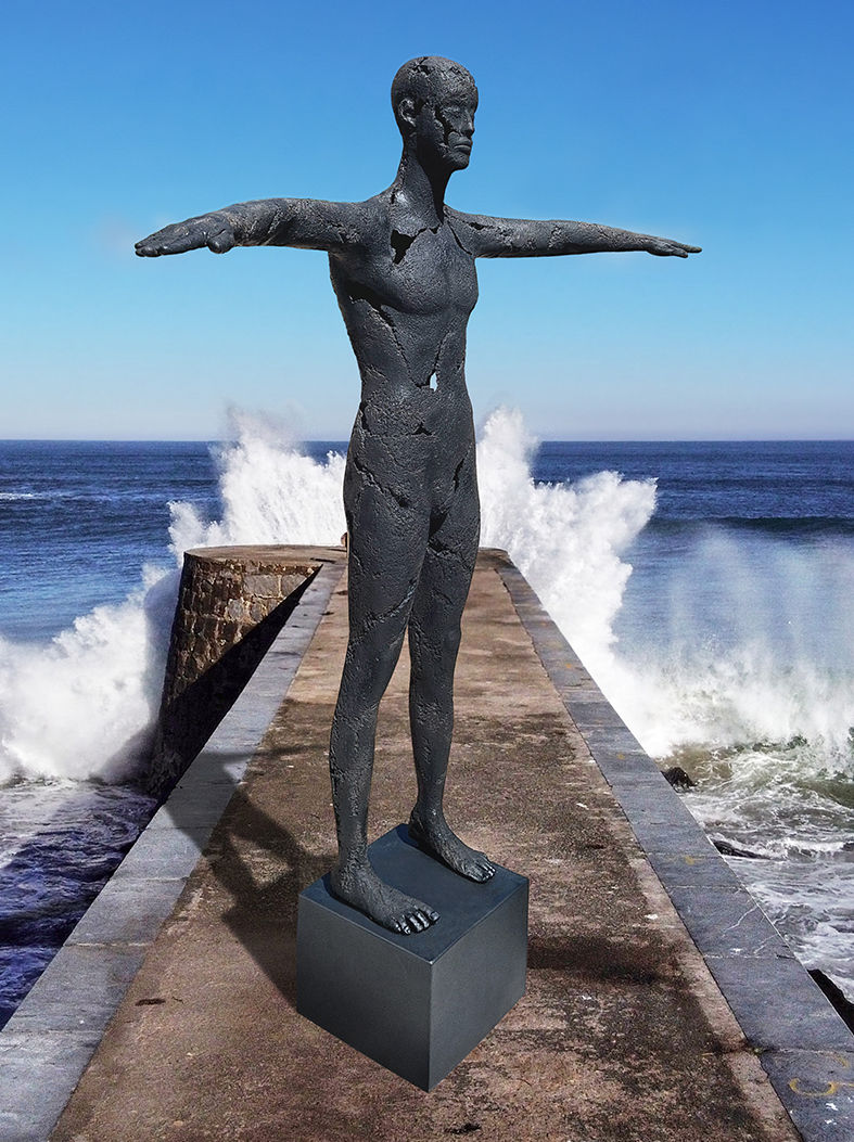 Life size sculpture in anthracite which has been hand formed and carved. The relief work produced by a chipping hammer to achieve the volcanic patination. Standing 2.2m high. Weight 110 kilos complete with the stone base. Build time 3.5 months