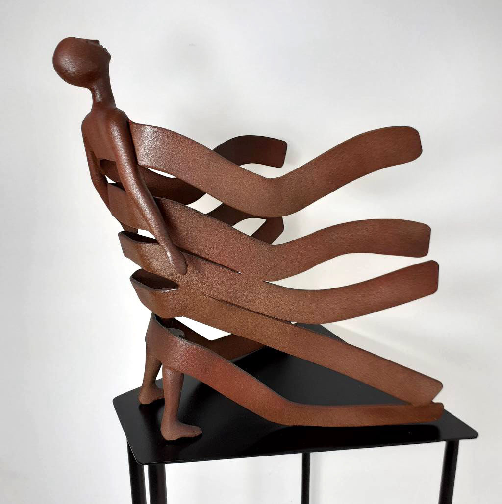 Hand carved and machined in solid Corten heavy gauge steel on a custom made steel base.Sculpture height 45cm. Overall height including base 1.4m.