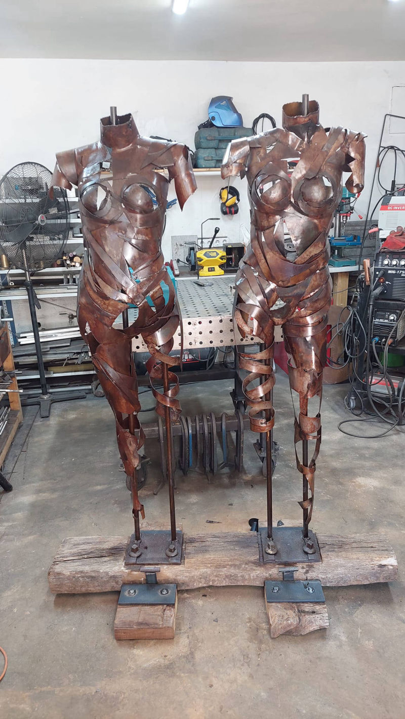 Life size steel forms with oxide patination. Mounted on a vintage railway sleeper with its original irons, complete with hand made cradles and wedges supporting the sleeper. Standing 1.83m tall x 1.37m wide at the sleeper.