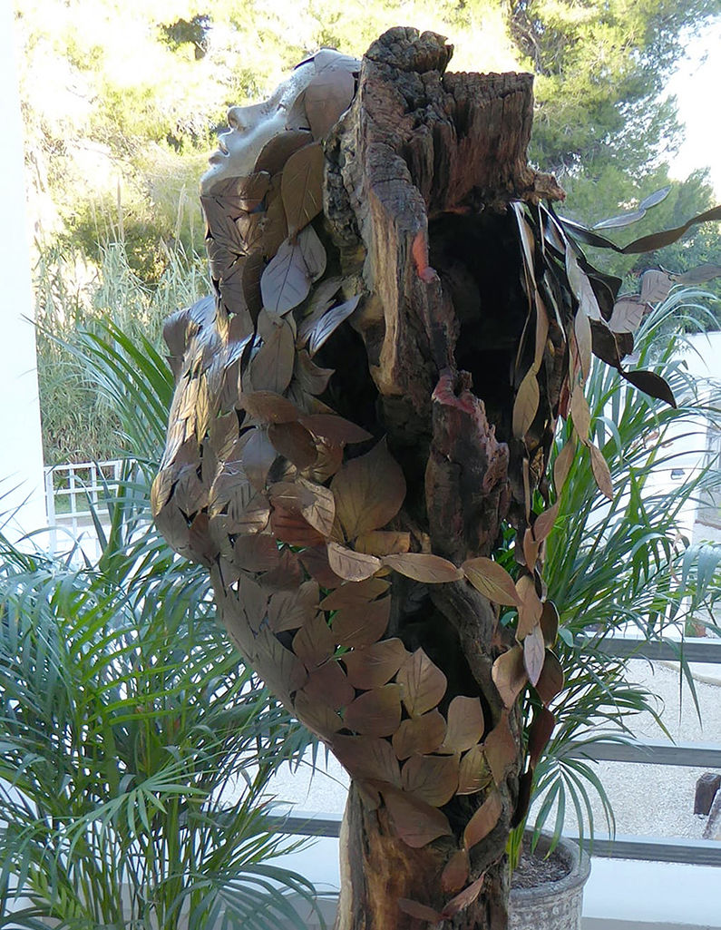 Life-size steel sculpture. Every leaf is different, hand cut, shaped over the anvil and engraved. The aluminium face and hands are cast by myself. This sculpture stands 6ft tall, made of 1.5mm steel and has a lacquer finish. Resting on a box steel base covered in engraved leaves.