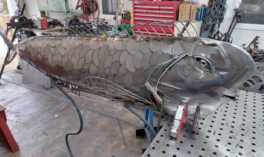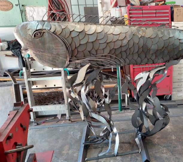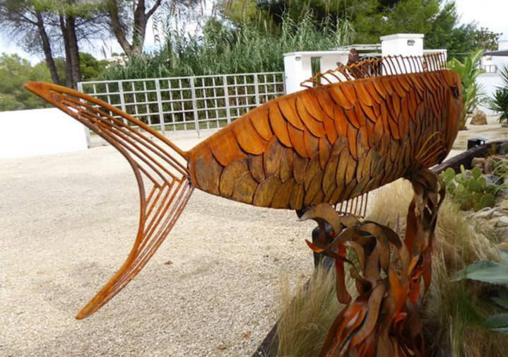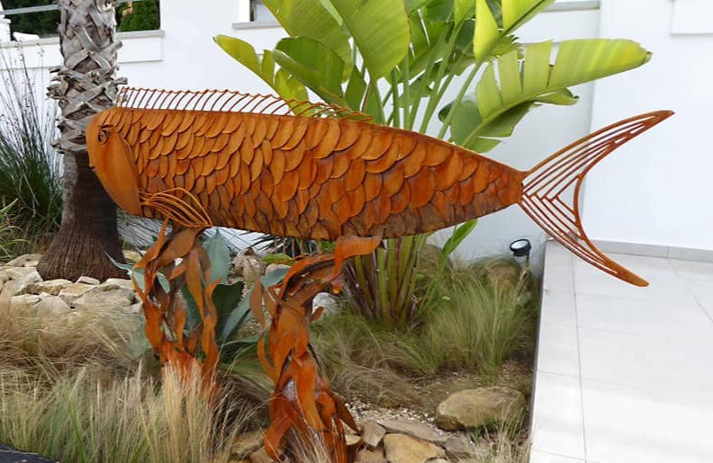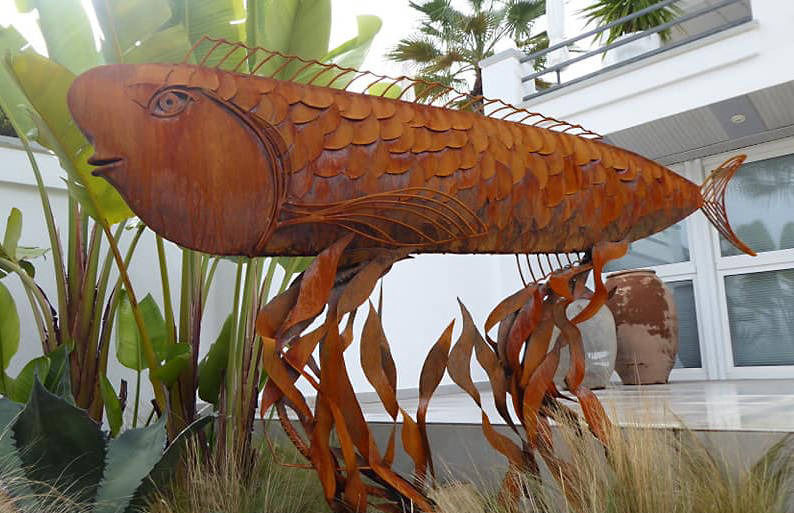 Giant steel fish garden sculpture resting on steel seaweed and chemically aged. Measures 2.4m long and 1.5m high.