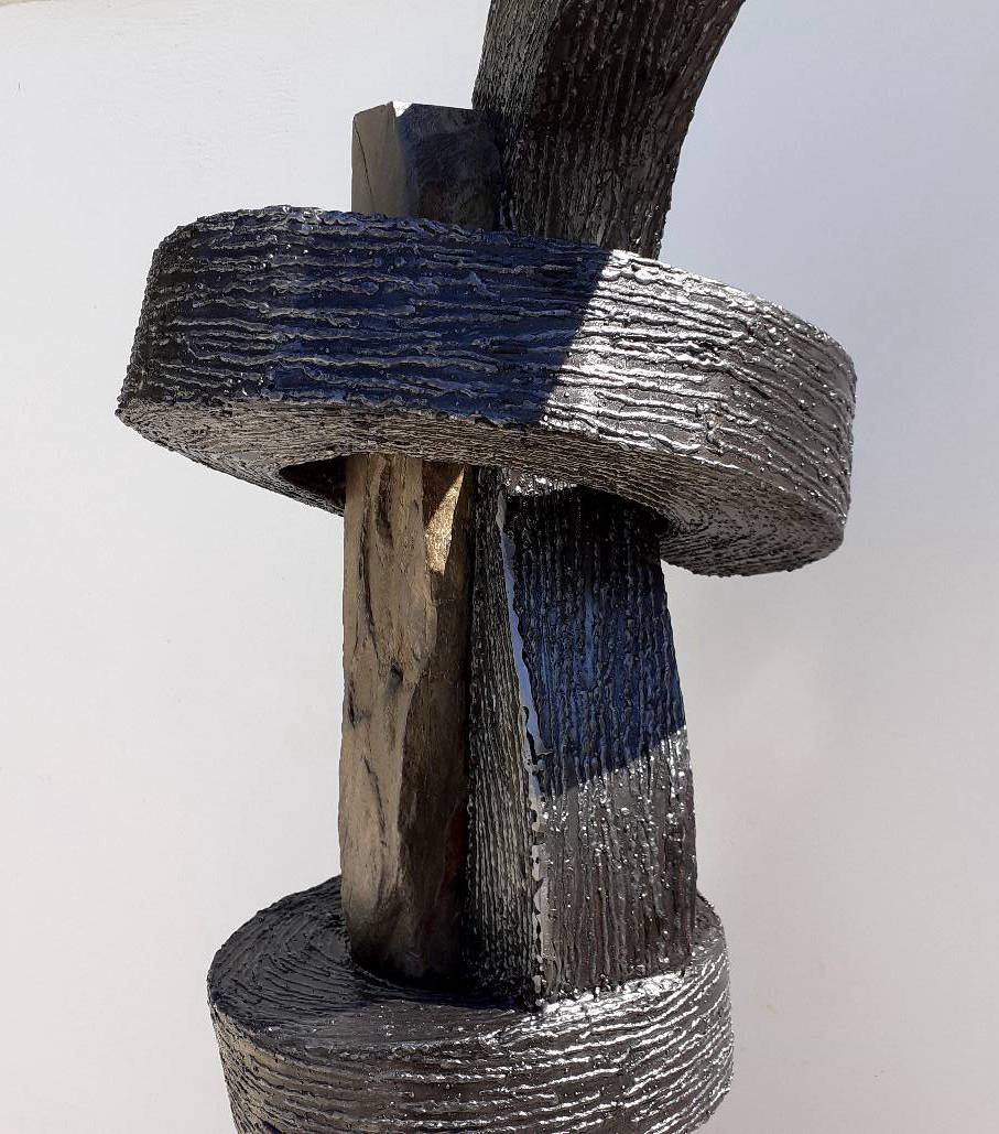 Gordian Knot sculpture in steel with trapped rock, texture welded finish and a Corten steel base.Standing 2m high.