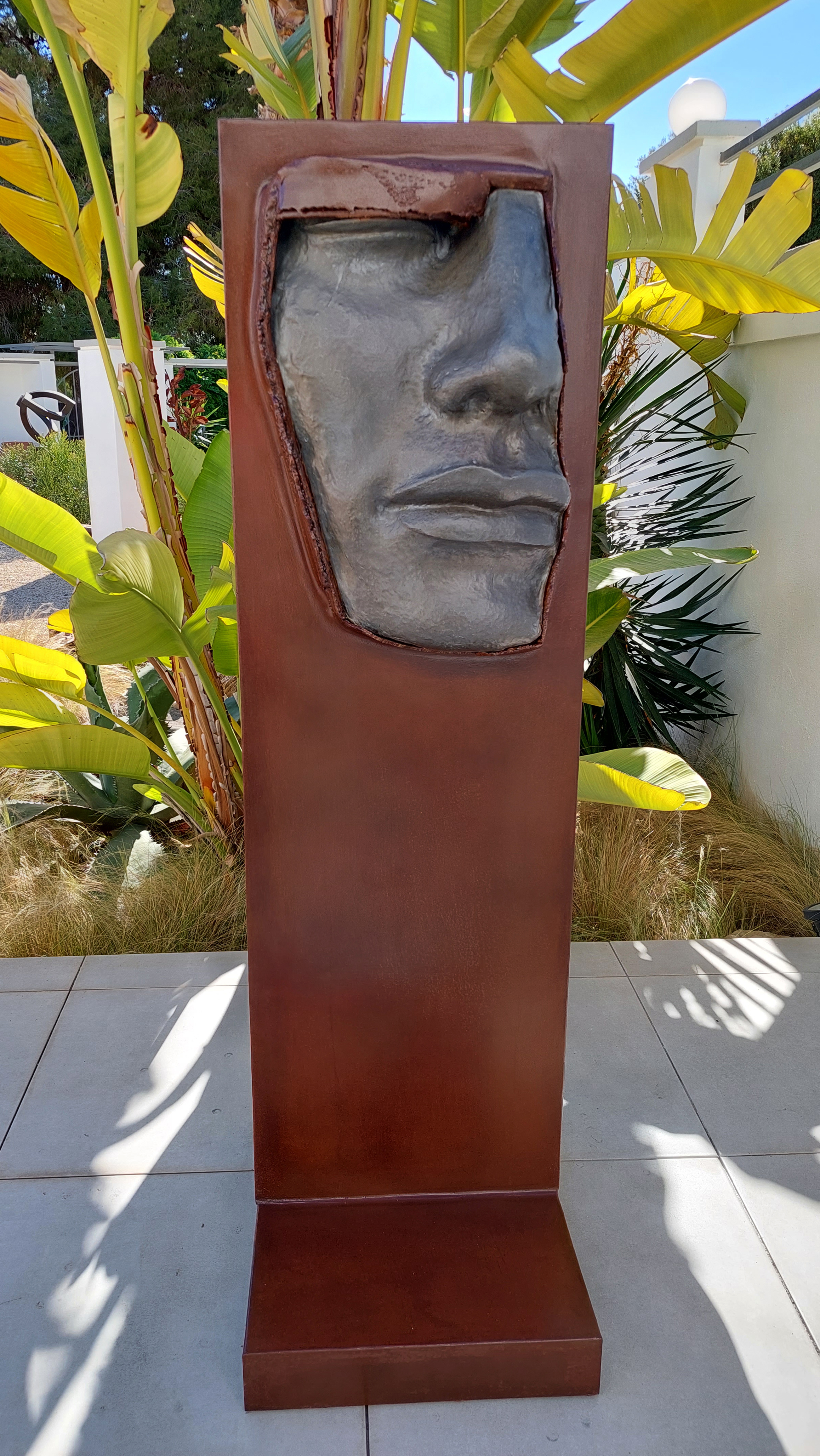 The lead alloy face is hand beaten into shape using traditional panel beating methods. This process is produced by many hours of manipulating metal over an anvil and steel shaping dollies by hammer. The face is supported by a corten steel structure complete with base.