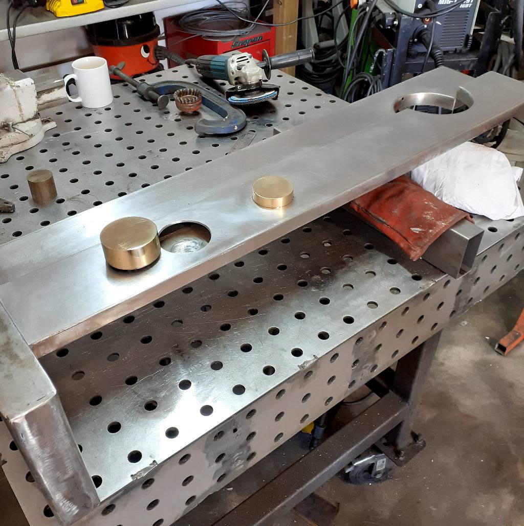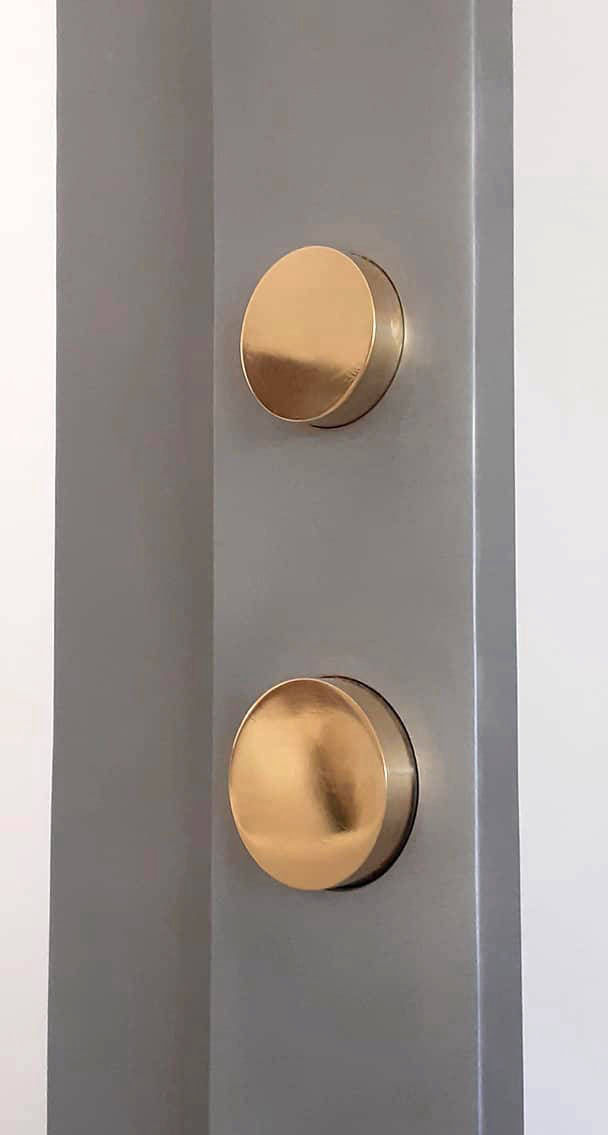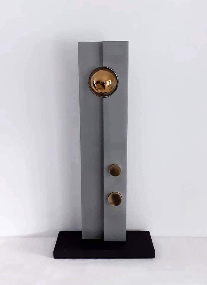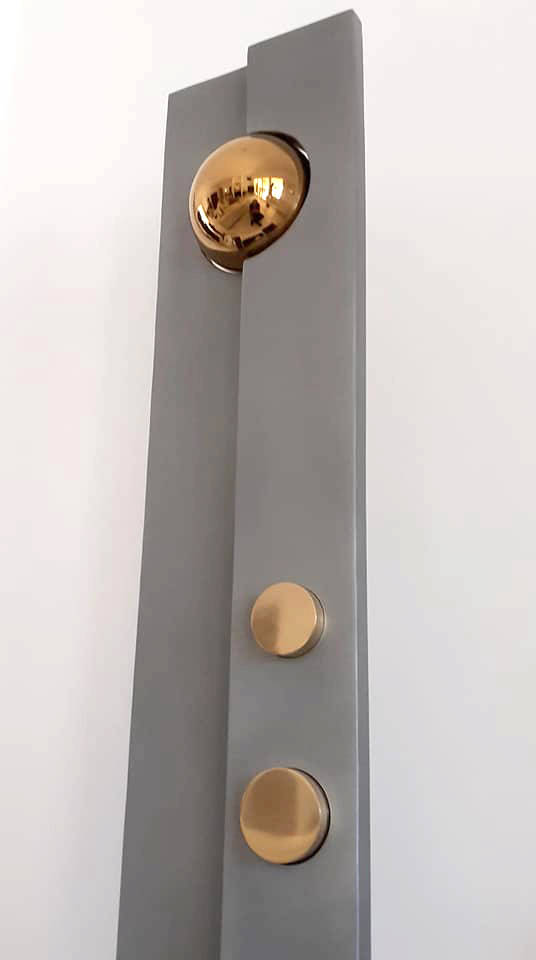 Abstract sculpture in polished steel, solid bronze rounds and gold plated stainless steel sphere.Standing 1.1m tall and built in 3mm thick steel with lacquer finish