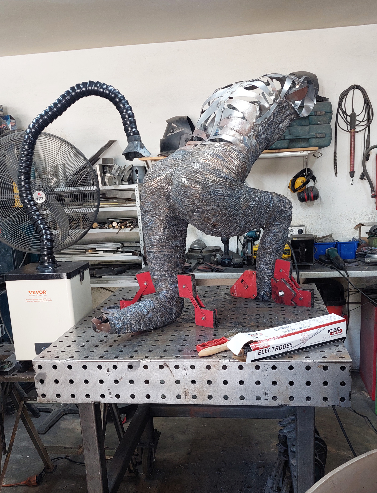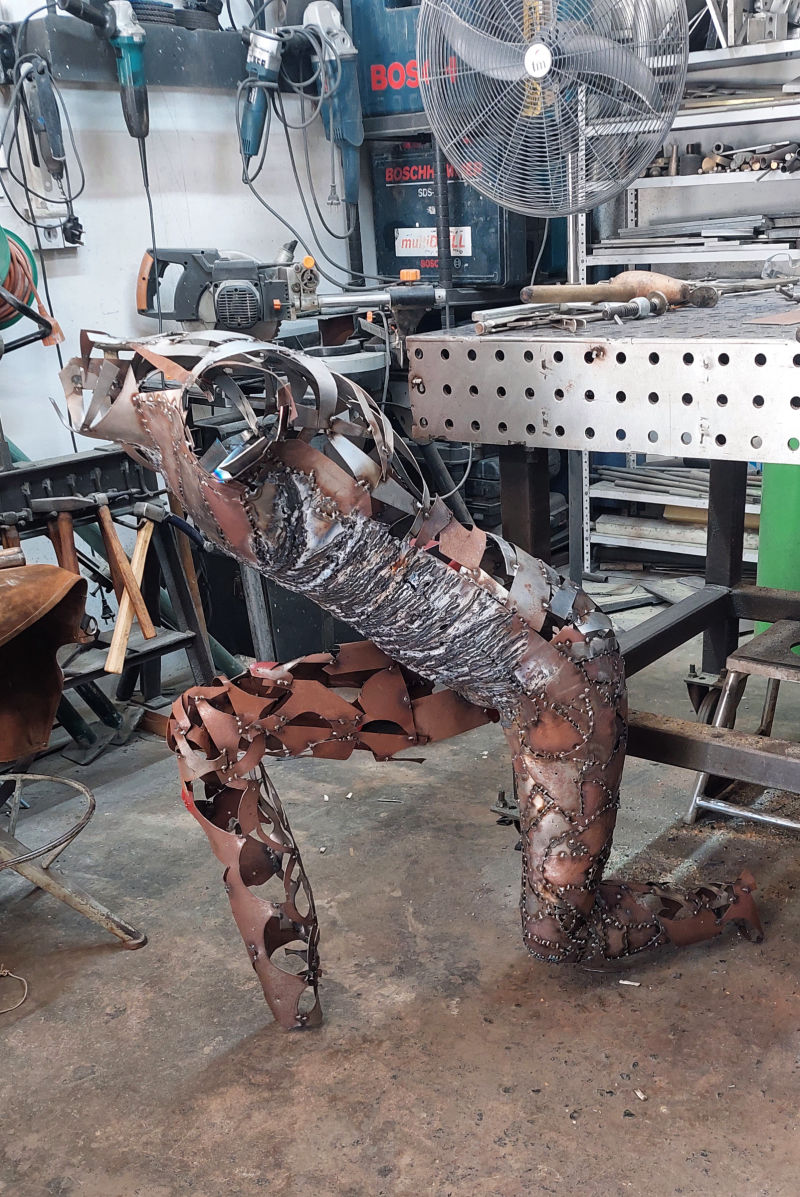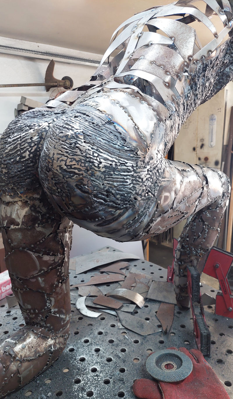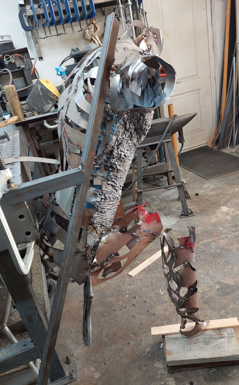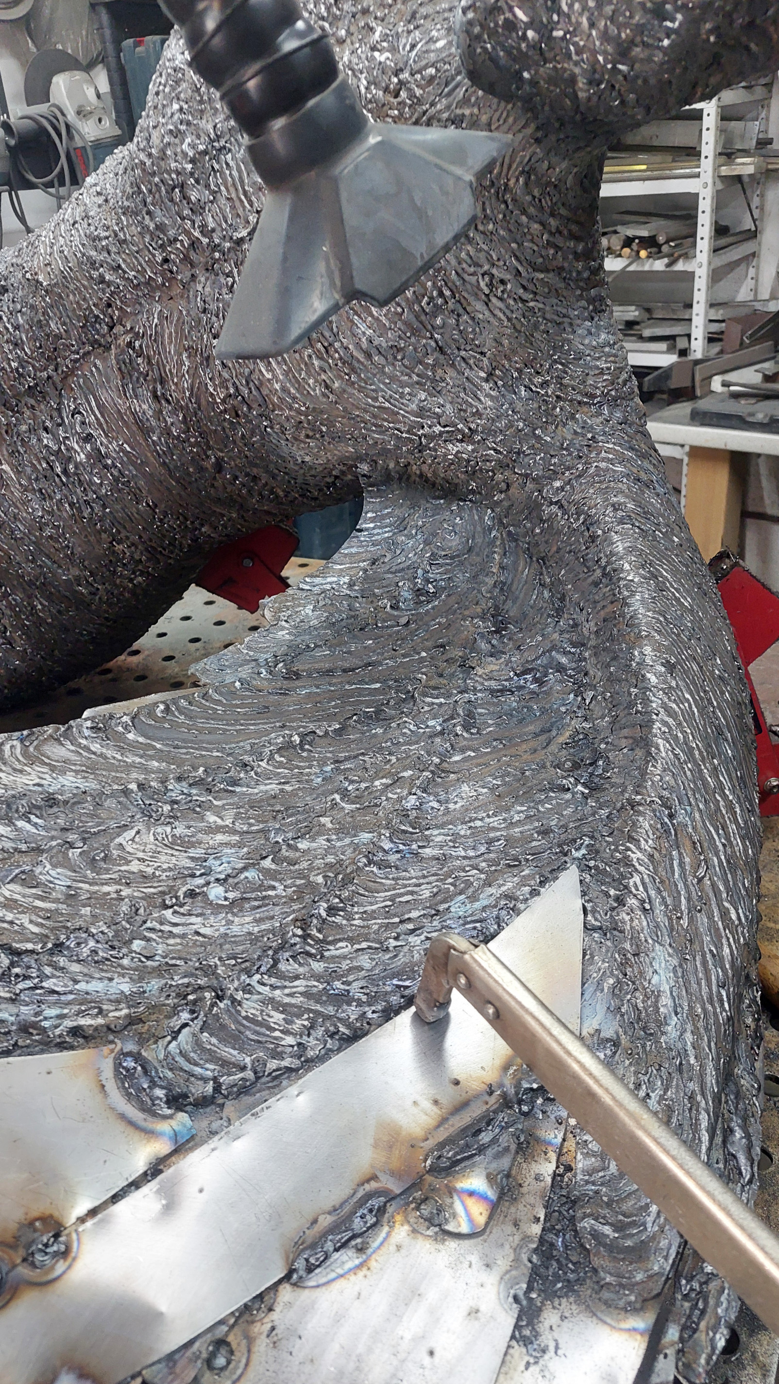 As the sculpture evolved and the form was ready to accept the final part to its build, a surface of arc weld was layered over the steel to produce the undulating patination... this whole process took many months to make (please see the build photos).