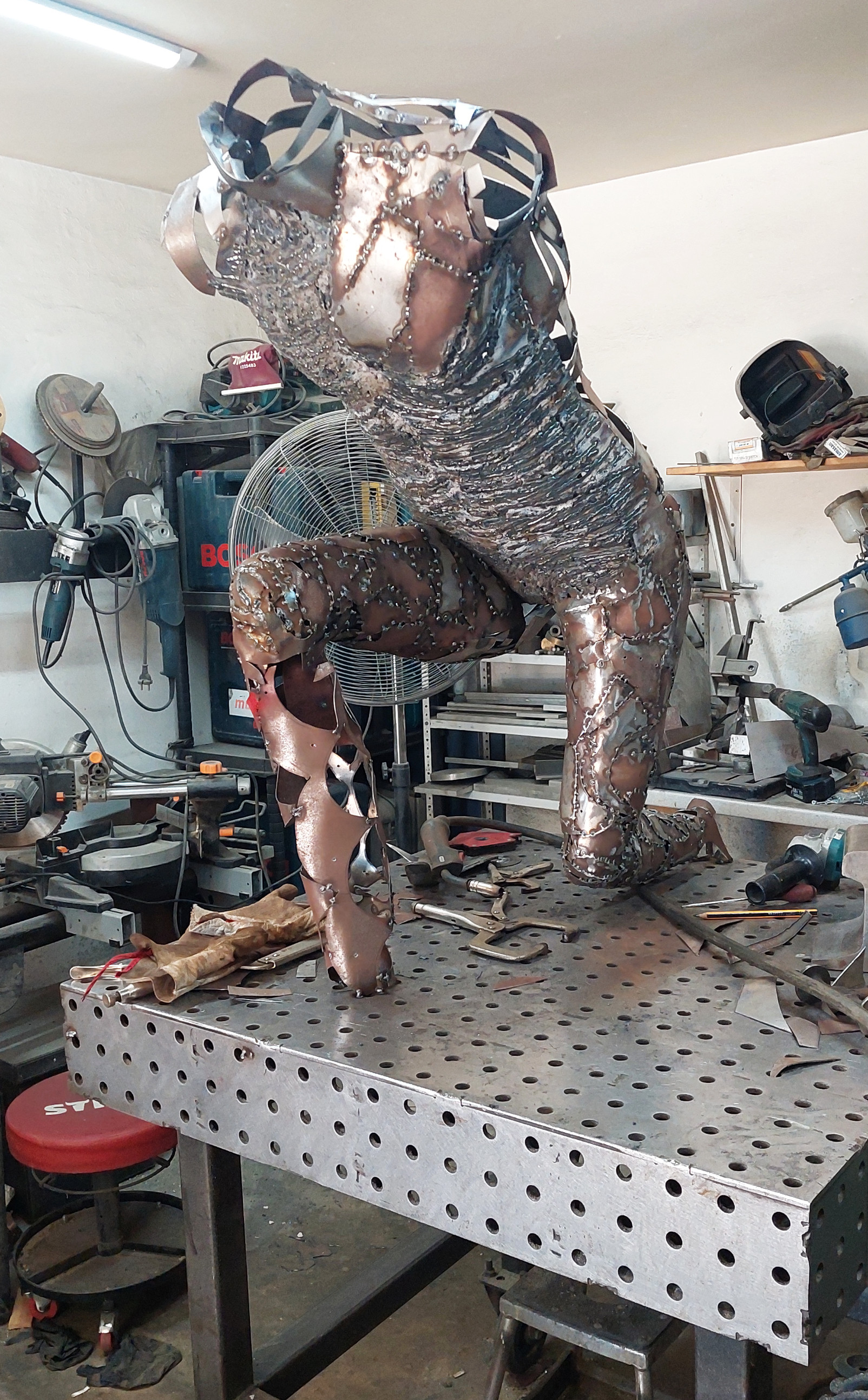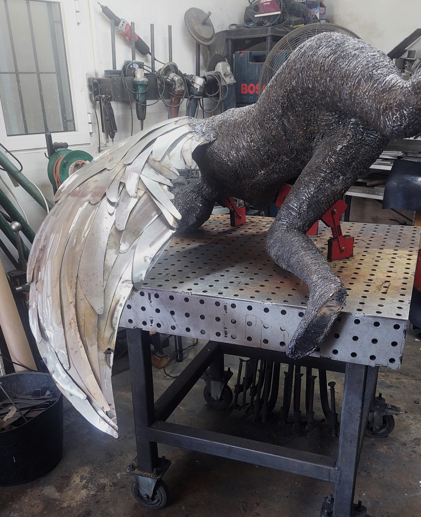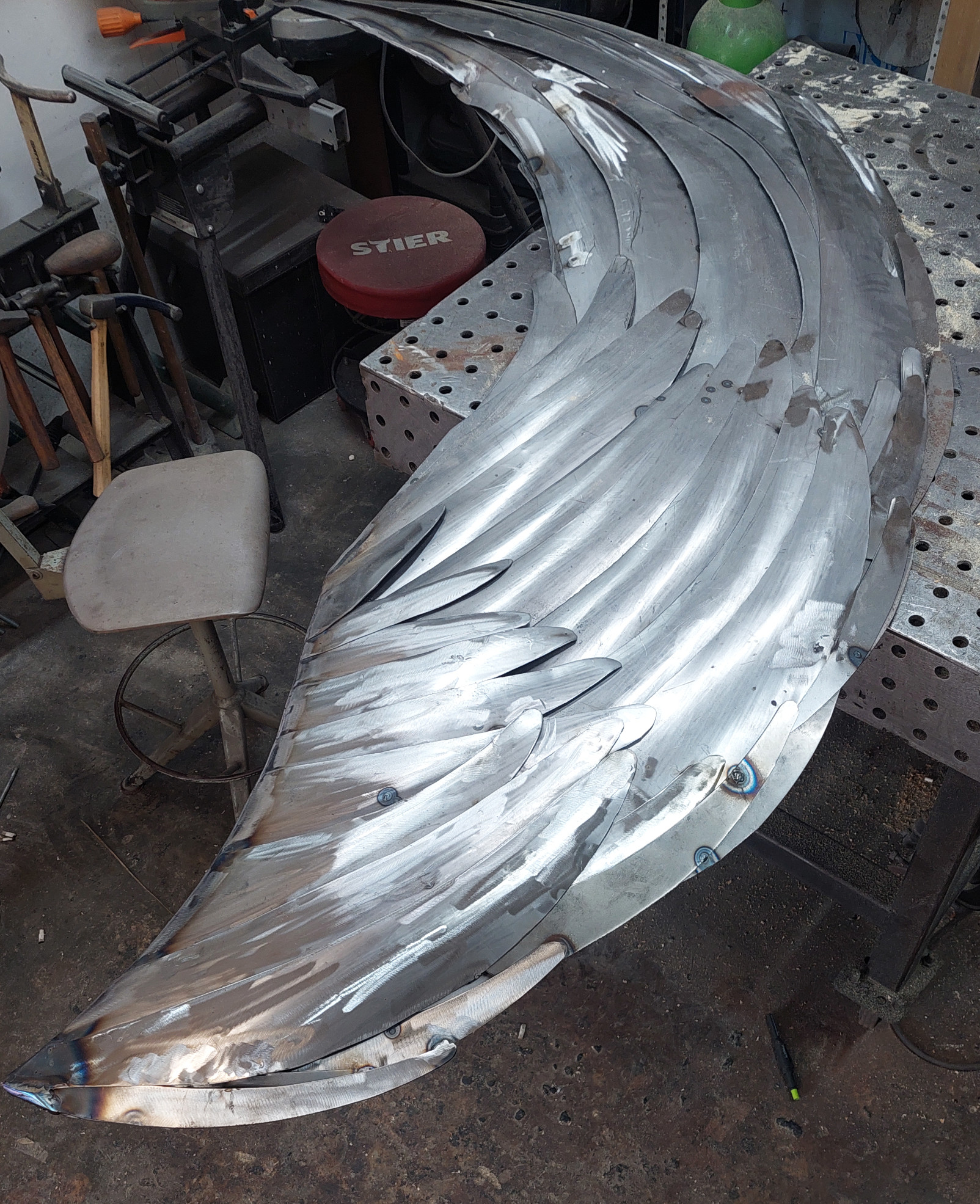 An armature of hand shaped steel plate sections, constructed over the anvil and welded together were used to form the body. The wings were made using the English Wheel, each section hand cut and given its curvature, then welded onto an armature of steel rods.