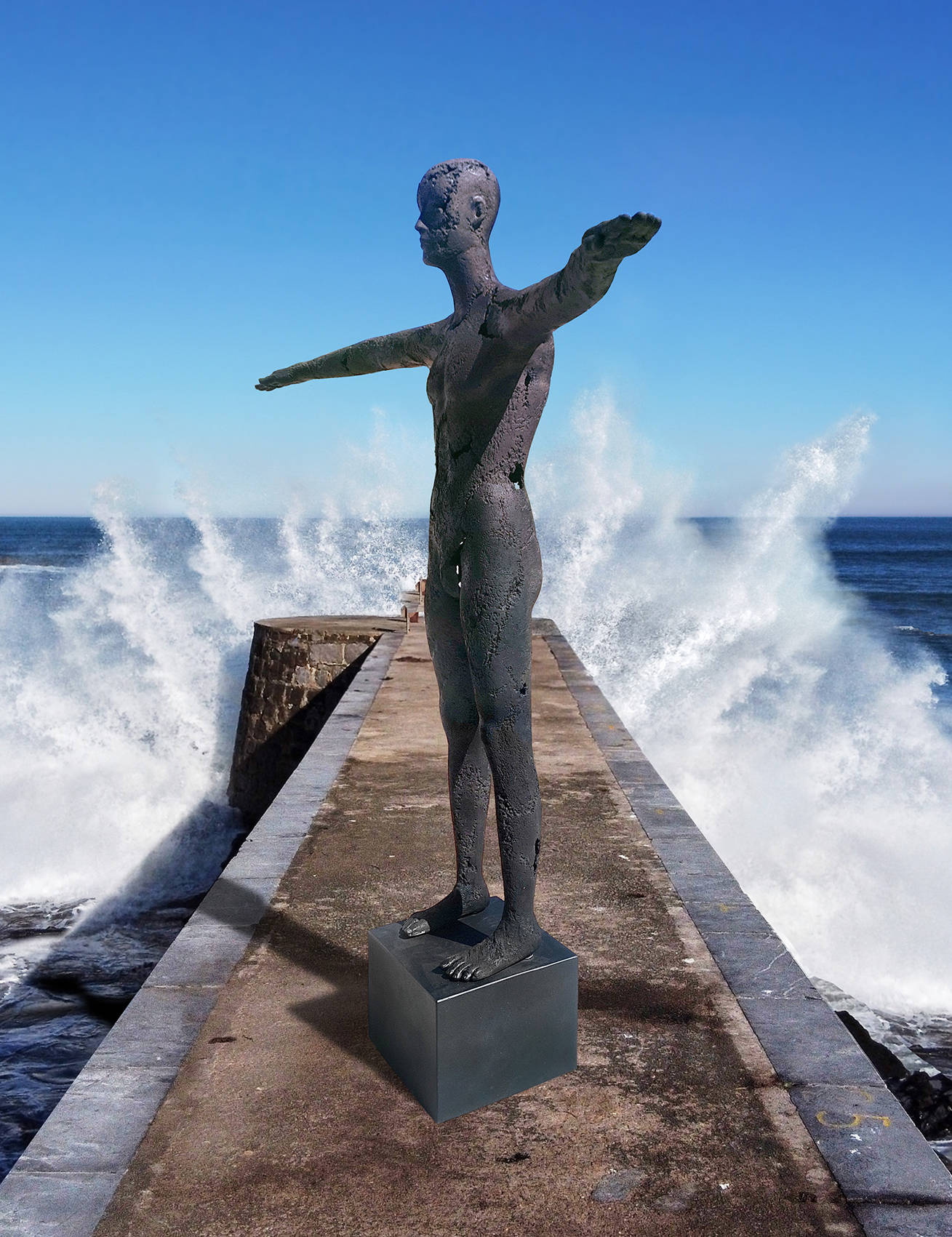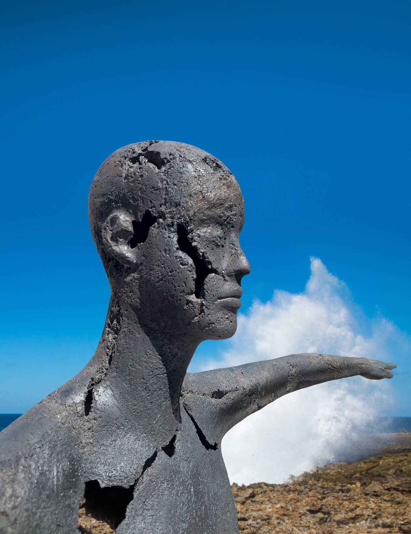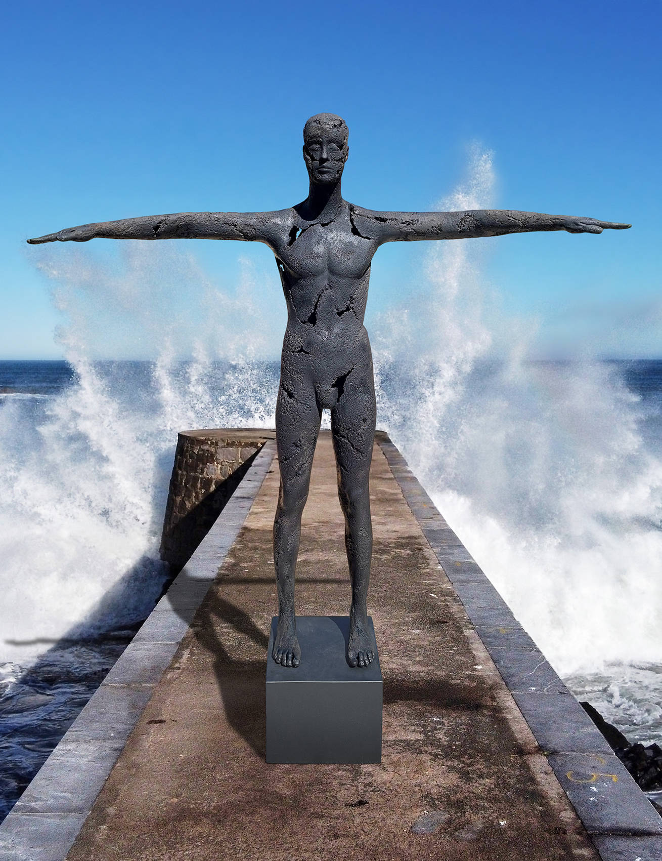 Life size sculpture in anthracite which has been hand formed and carved. The relief work produced by a chipping hammer to achieve the volcanic patination. Standing 2.2m high. Weight 110 kilos complete with the stone base. Build time 3.5 months