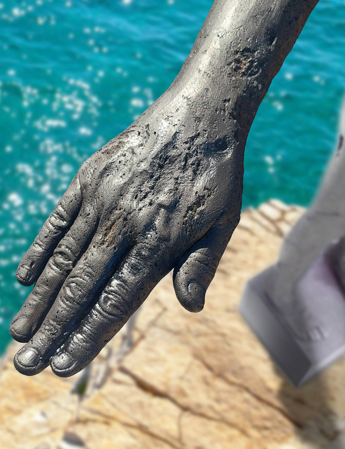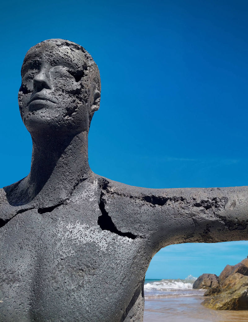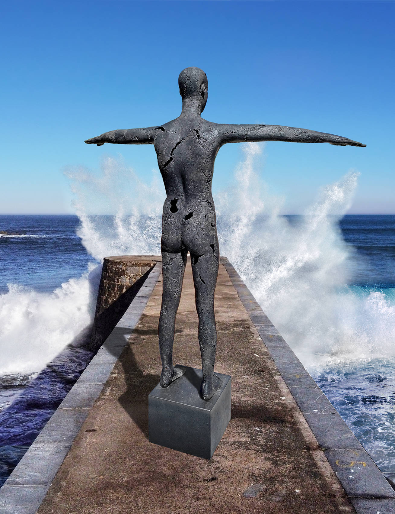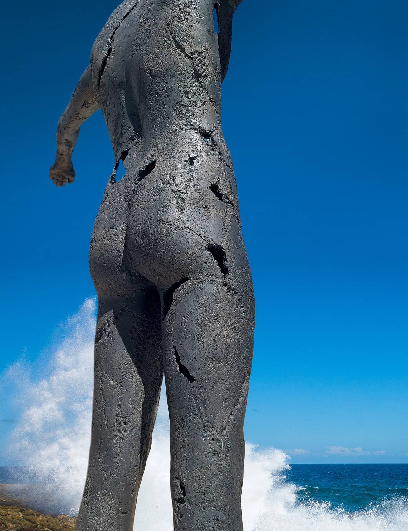 Life size sculpture in anthracite which has been hand formed and carved. The relief work produced by a chipping hammer to achieve the volcanic patination. Standing 2.2m high. Weight 110 kilos complete with the stone base. Build time 3.5 months