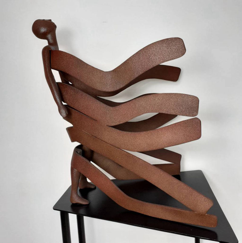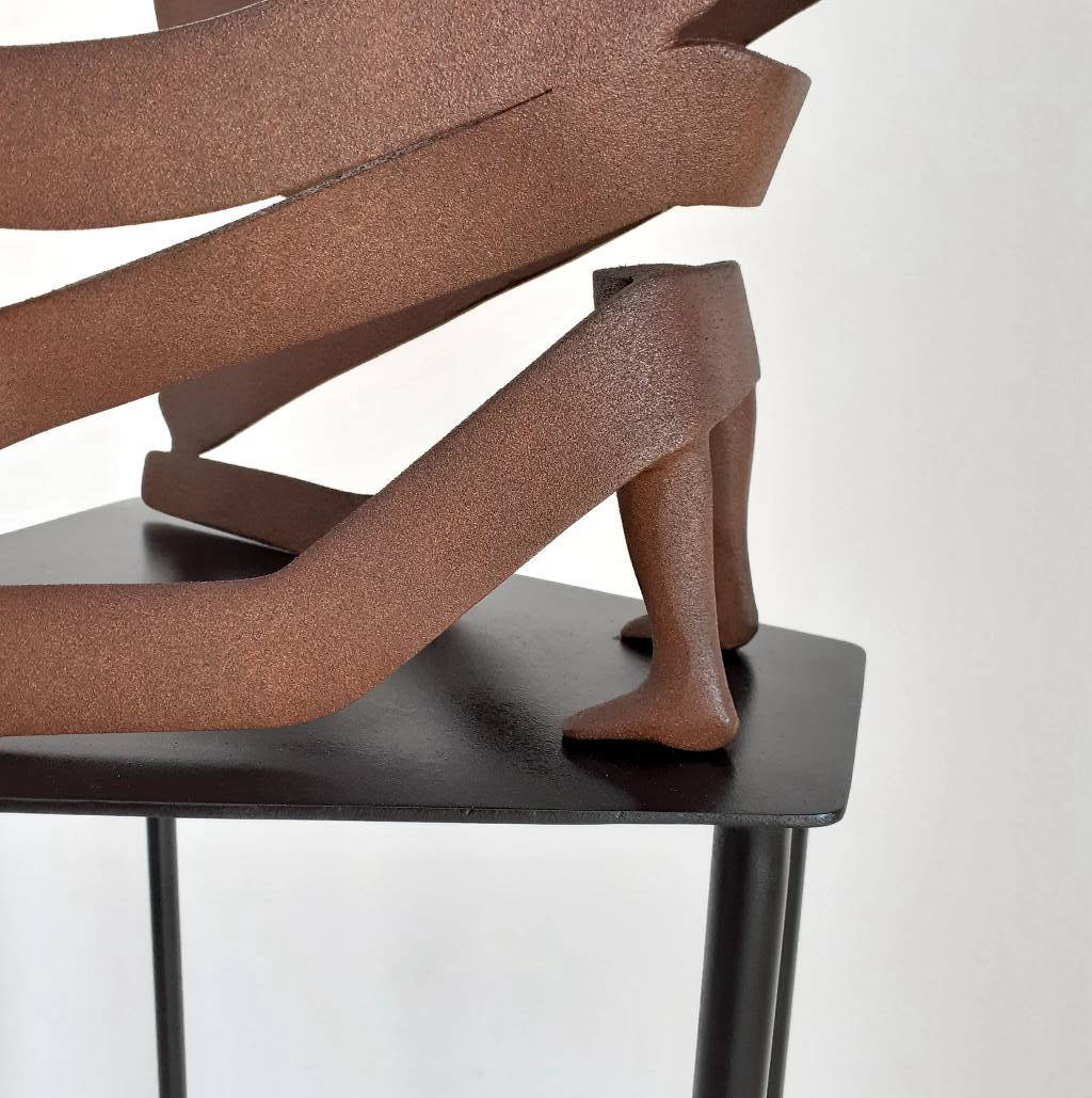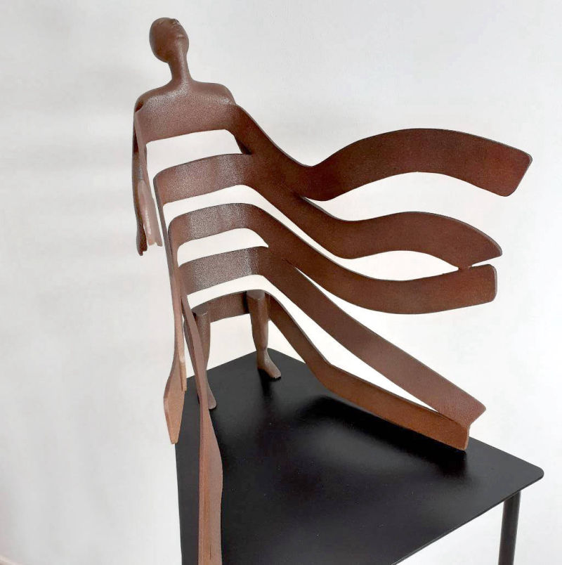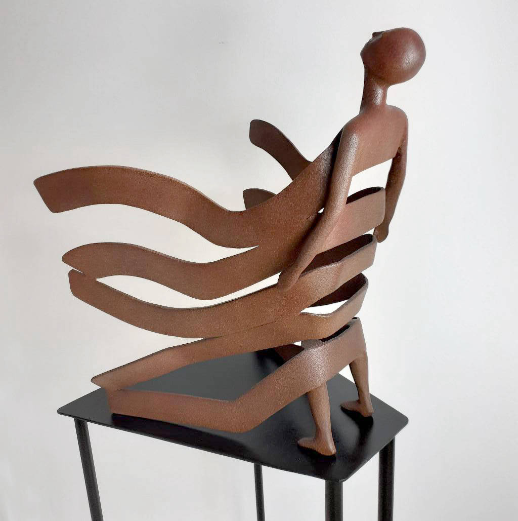 Hand carved and machined in solid Corten heavy gauge steel on a custom made steel base.Sculpture height 45cm. Overall height including base 1.4m.