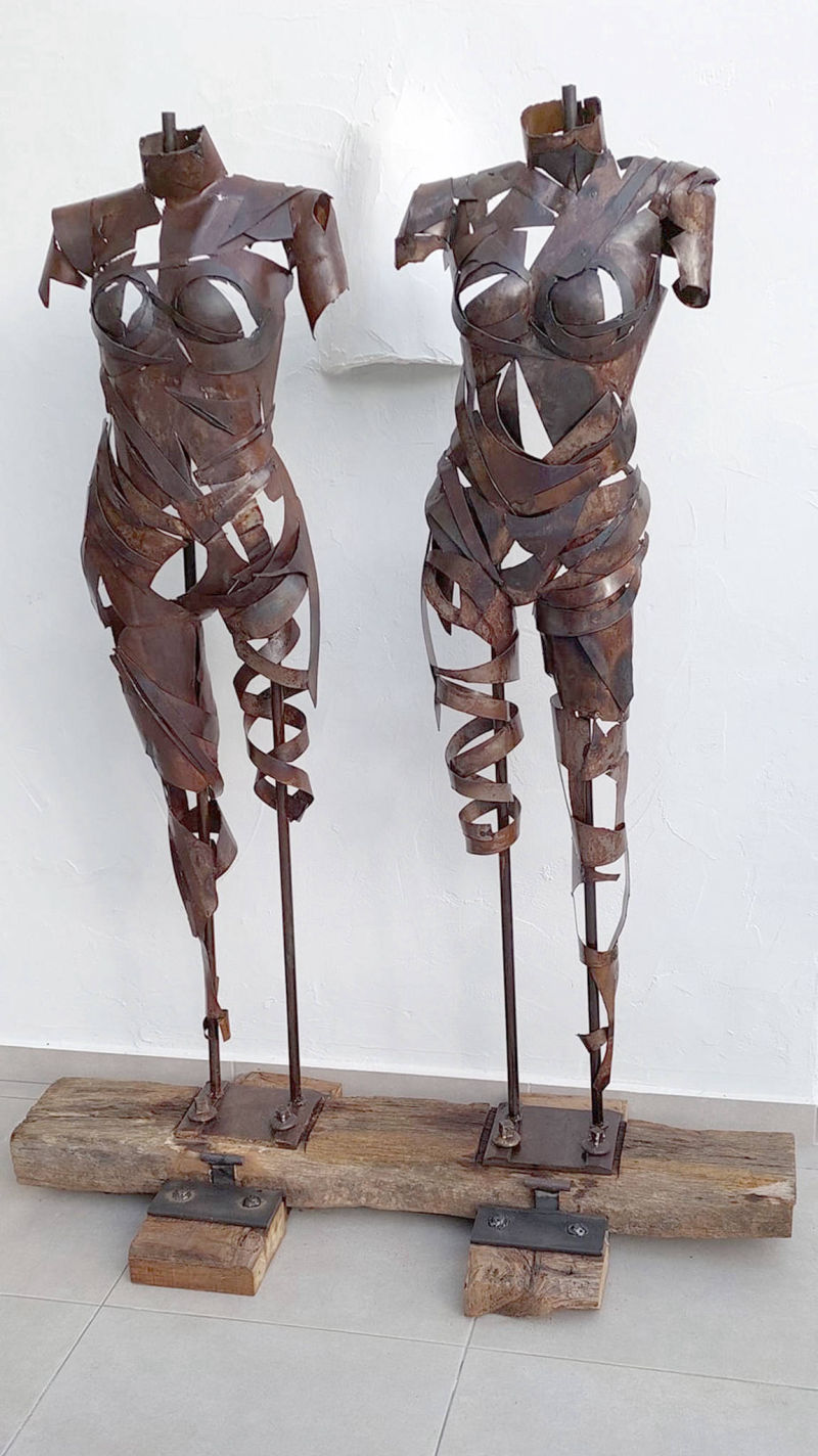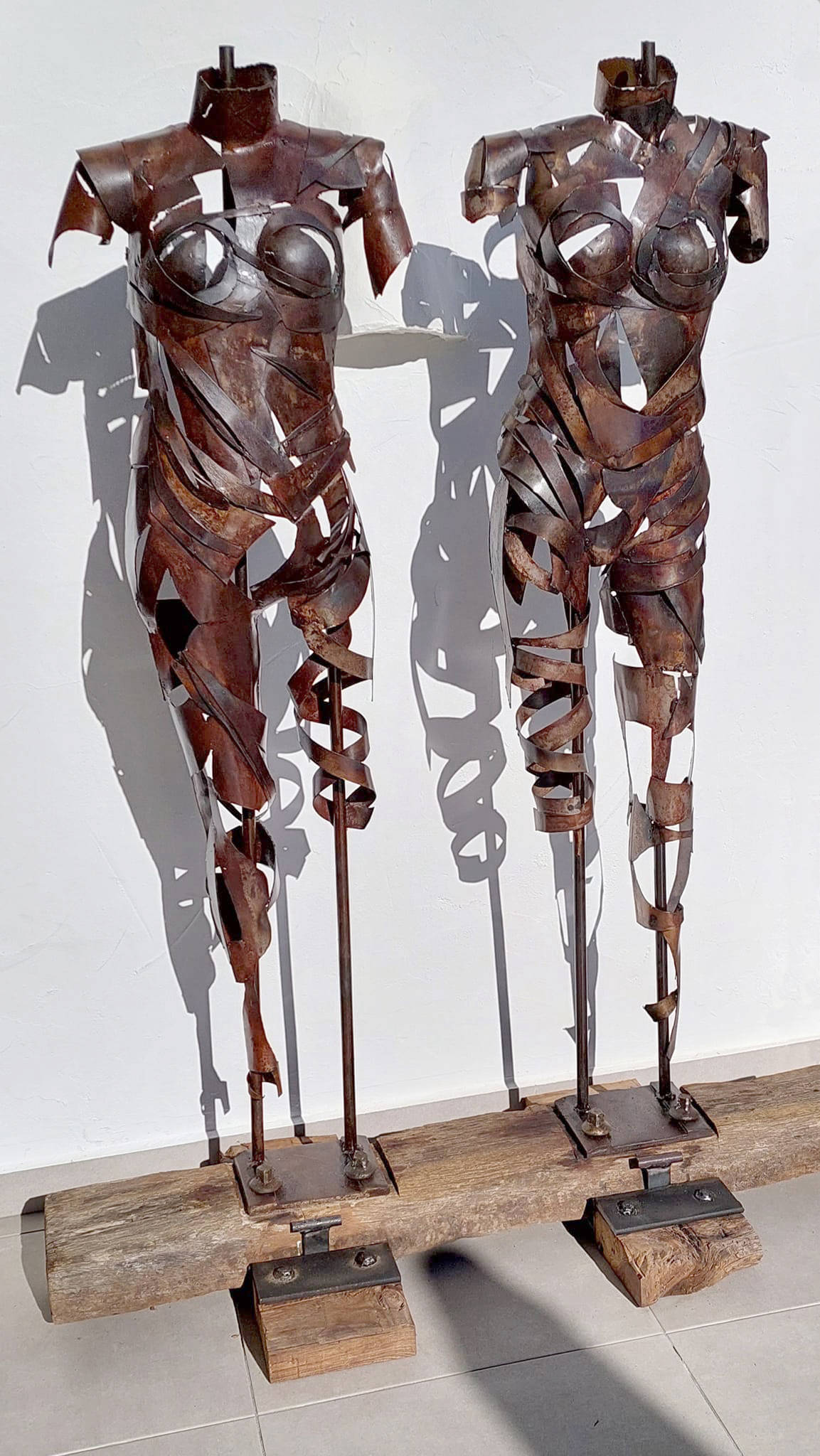 Life size steel forms with oxide patination. Mounted on a vintage railway sleeper with its original irons, complete with hand made cradles and wedges supporting the sleeper. Standing 1.83m tall x 1.37m wide at the sleeper.