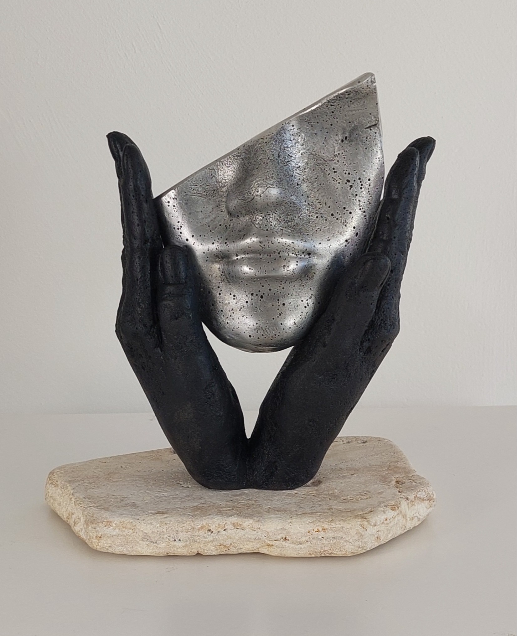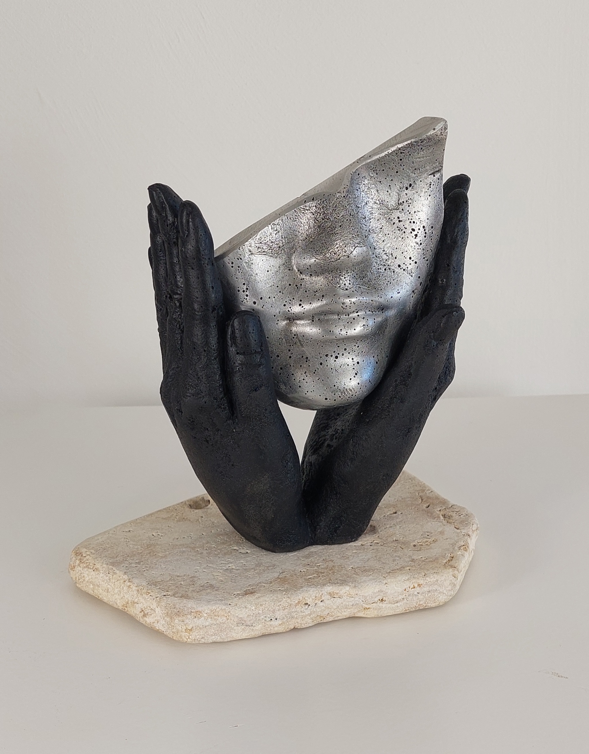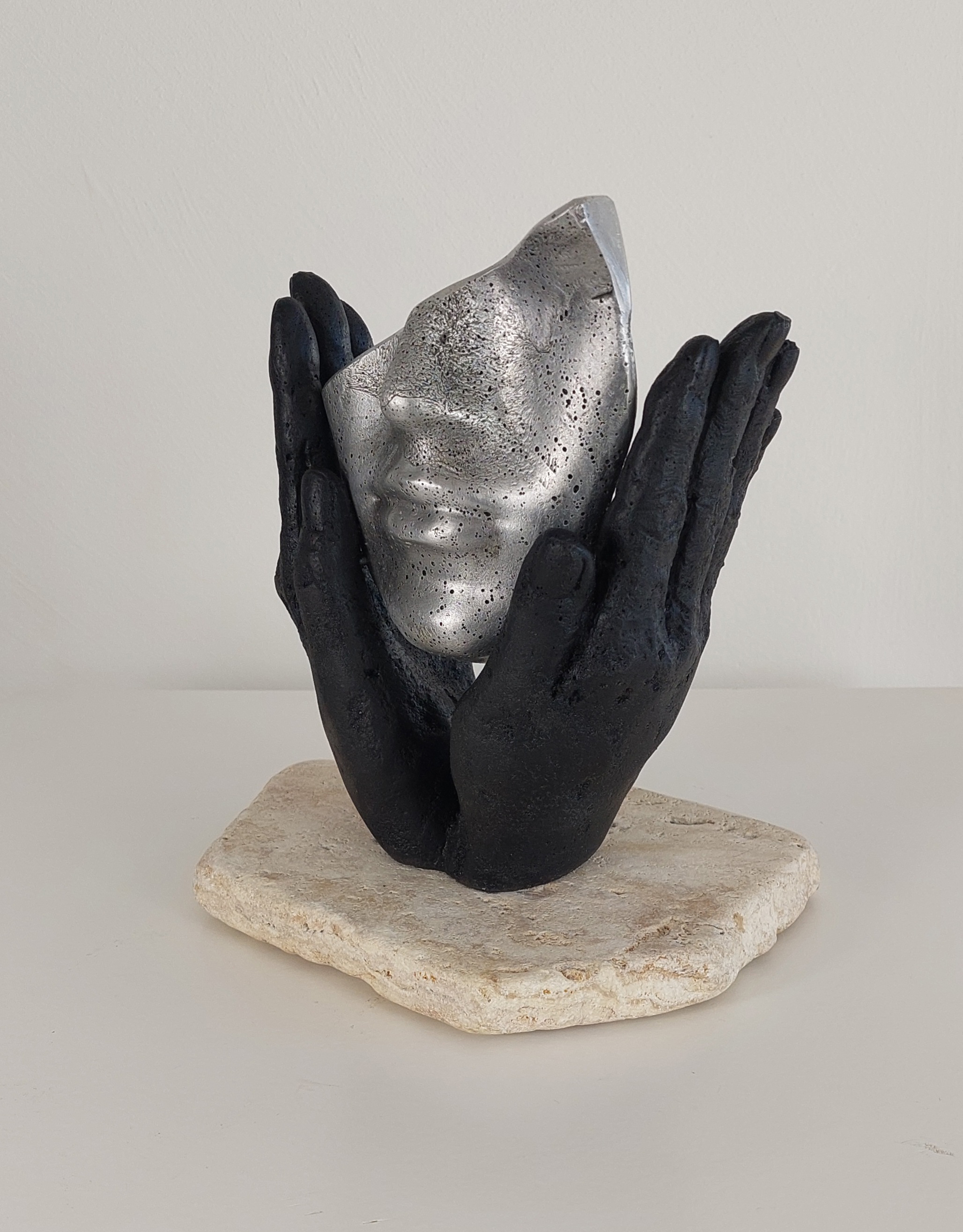 Aluminium and Anthracite on a travertine base. A male with a females hands cupping his face in her palms. The solid aluminium face I cast using my own foundry and the Anthracite hands I carved from the solid form.