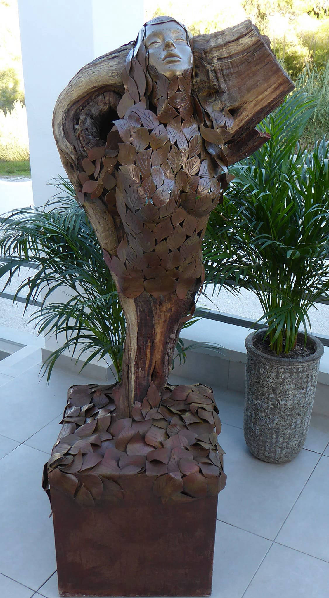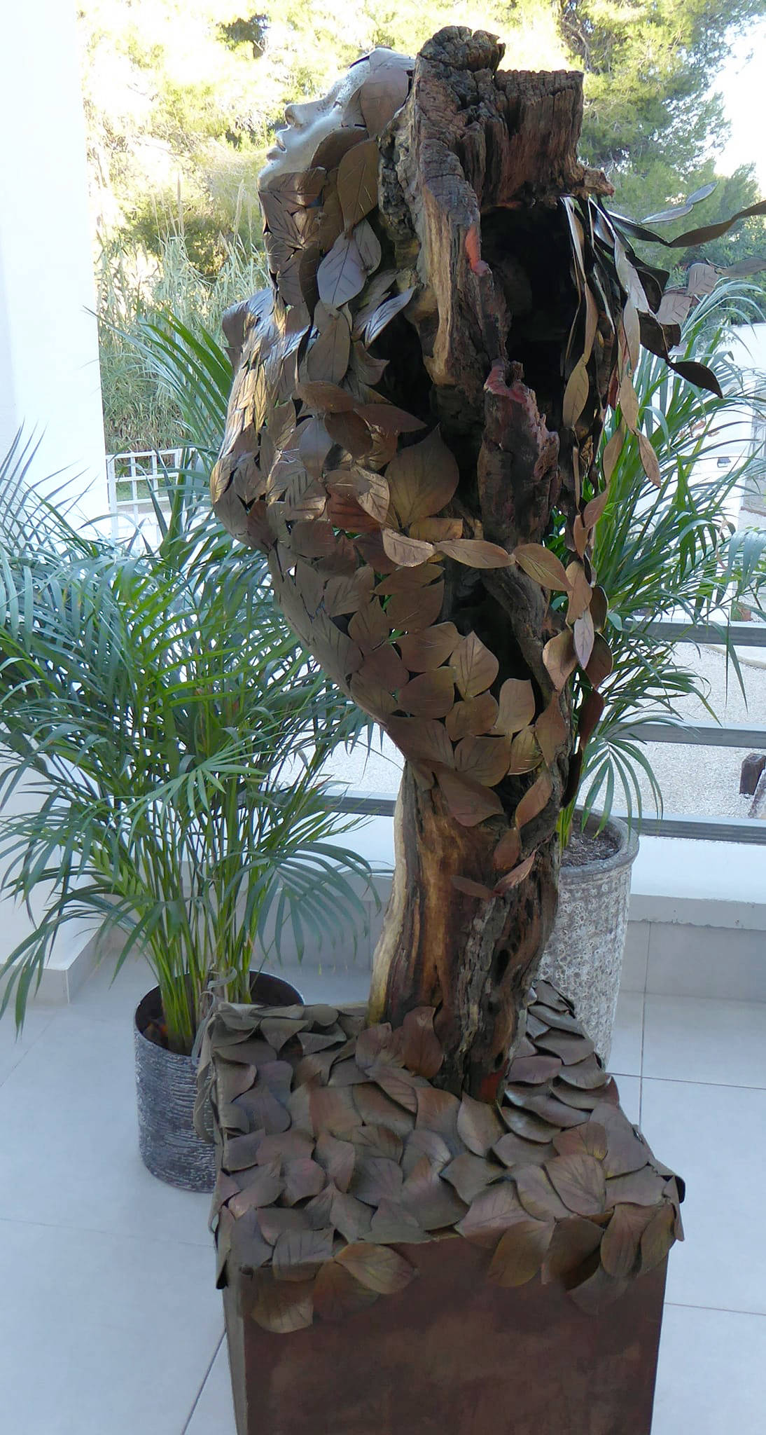 Life-size steel sculpture. Every leaf is different, hand cut, shaped over the anvil and engraved. The aluminium face and hands are cast by myself. This sculpture stands 6ft tall, made of 1.5mm steel and has a lacquer finish. Resting on a box steel base covered in engraved leaves.