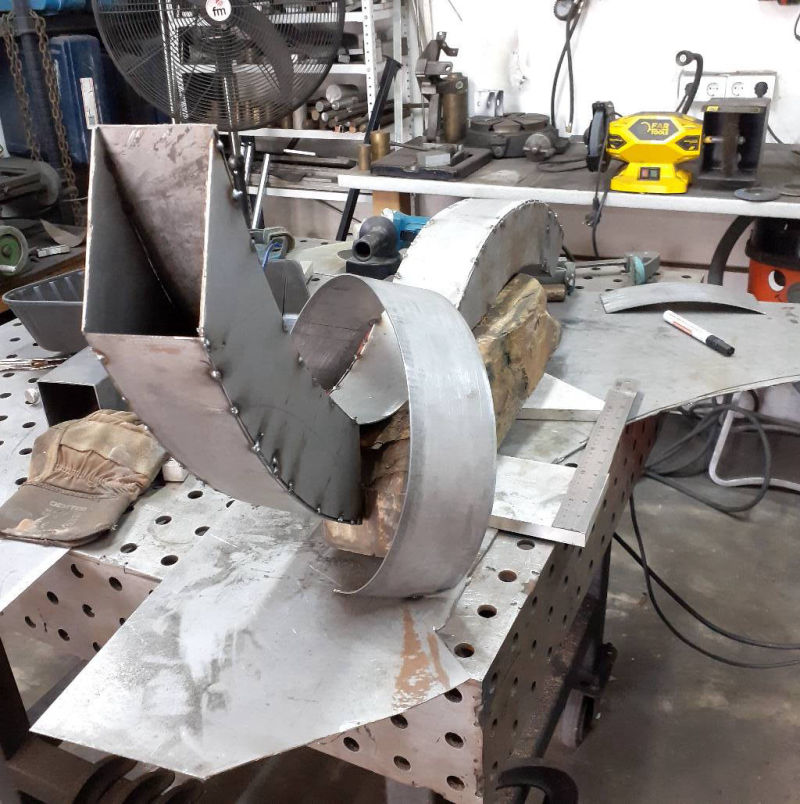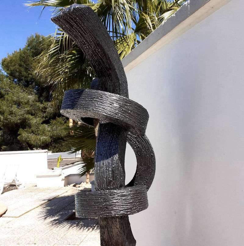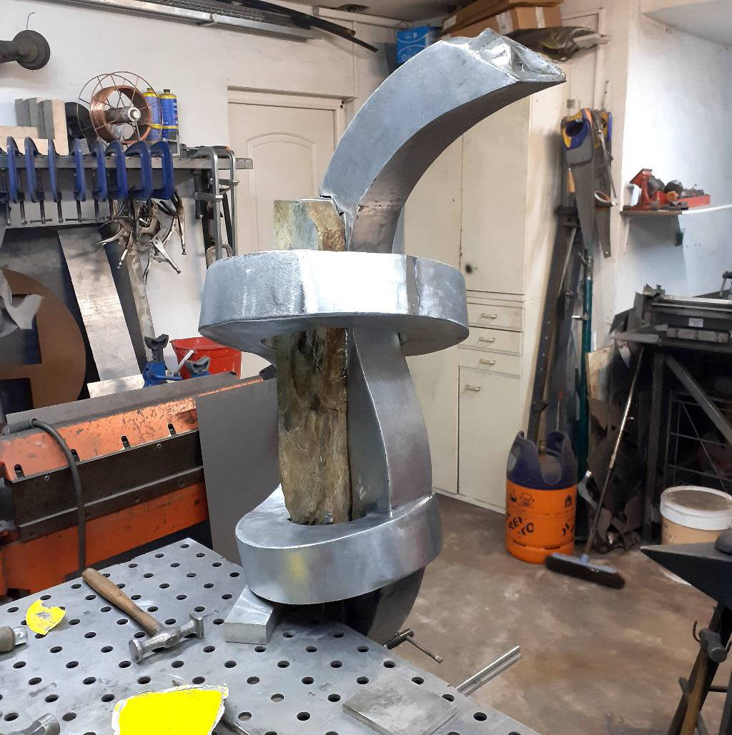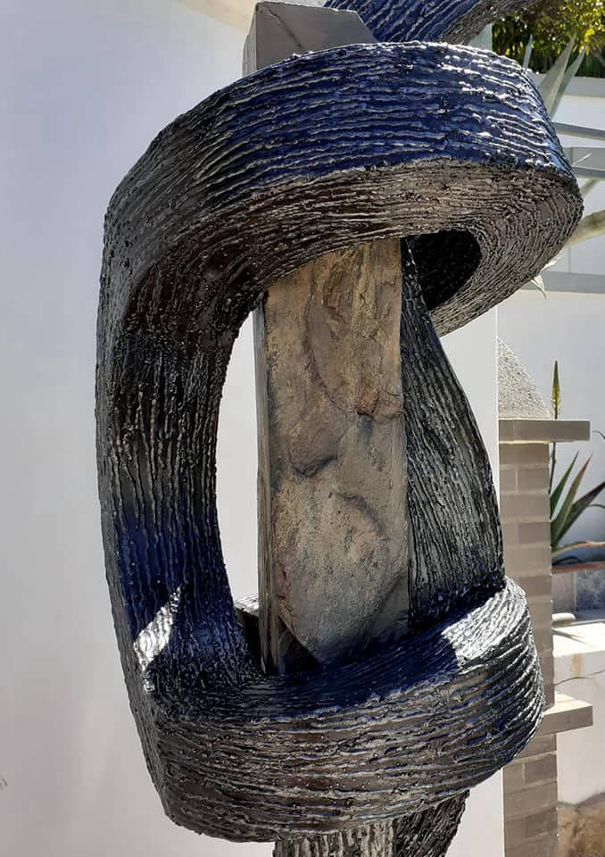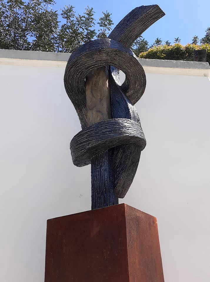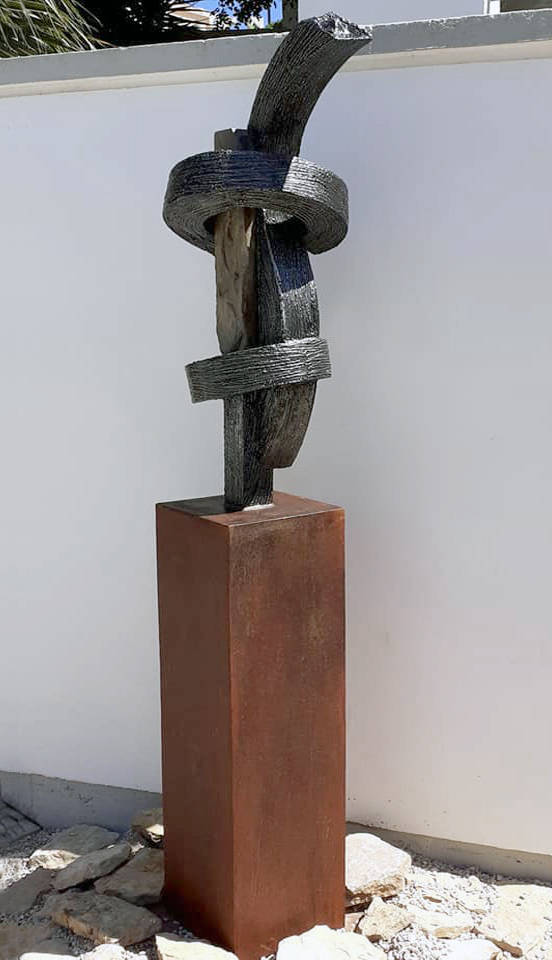 Gordian Knot sculpture in steel with trapped rock, texture welded finish and a Corten steel base.Standing 2m high.