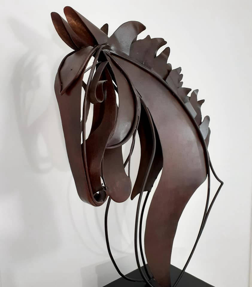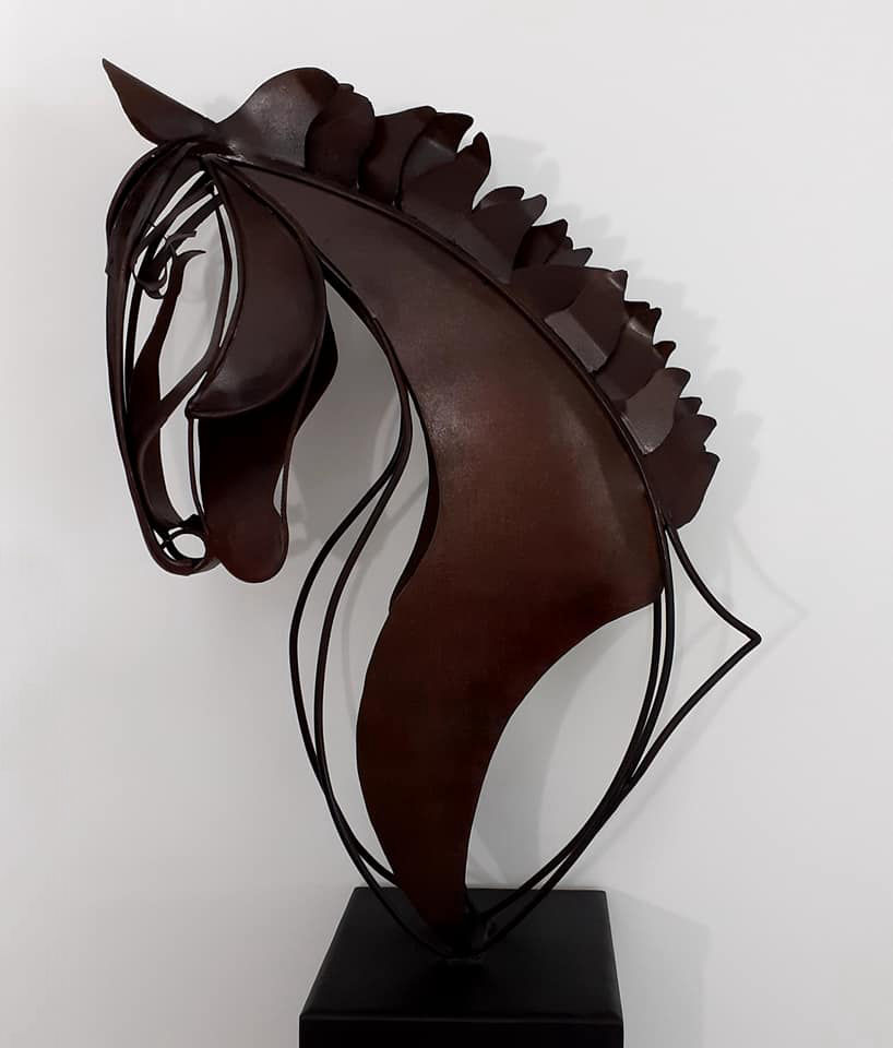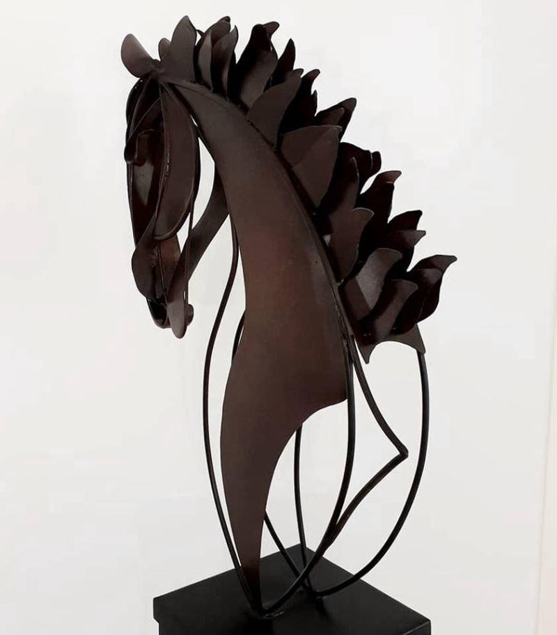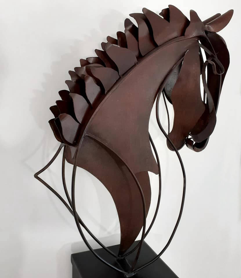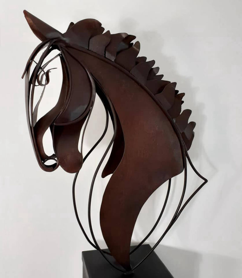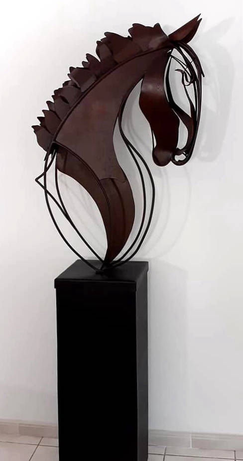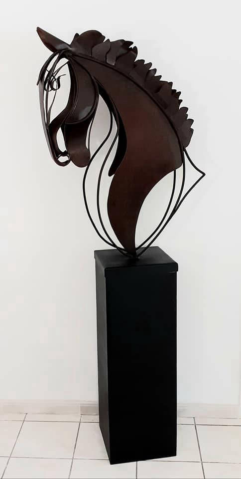 Unique life size steel horse head on a heavy steel base standing 6ft 9in (204cm) tall overall. Chemically aged with a matt lacquer finish.