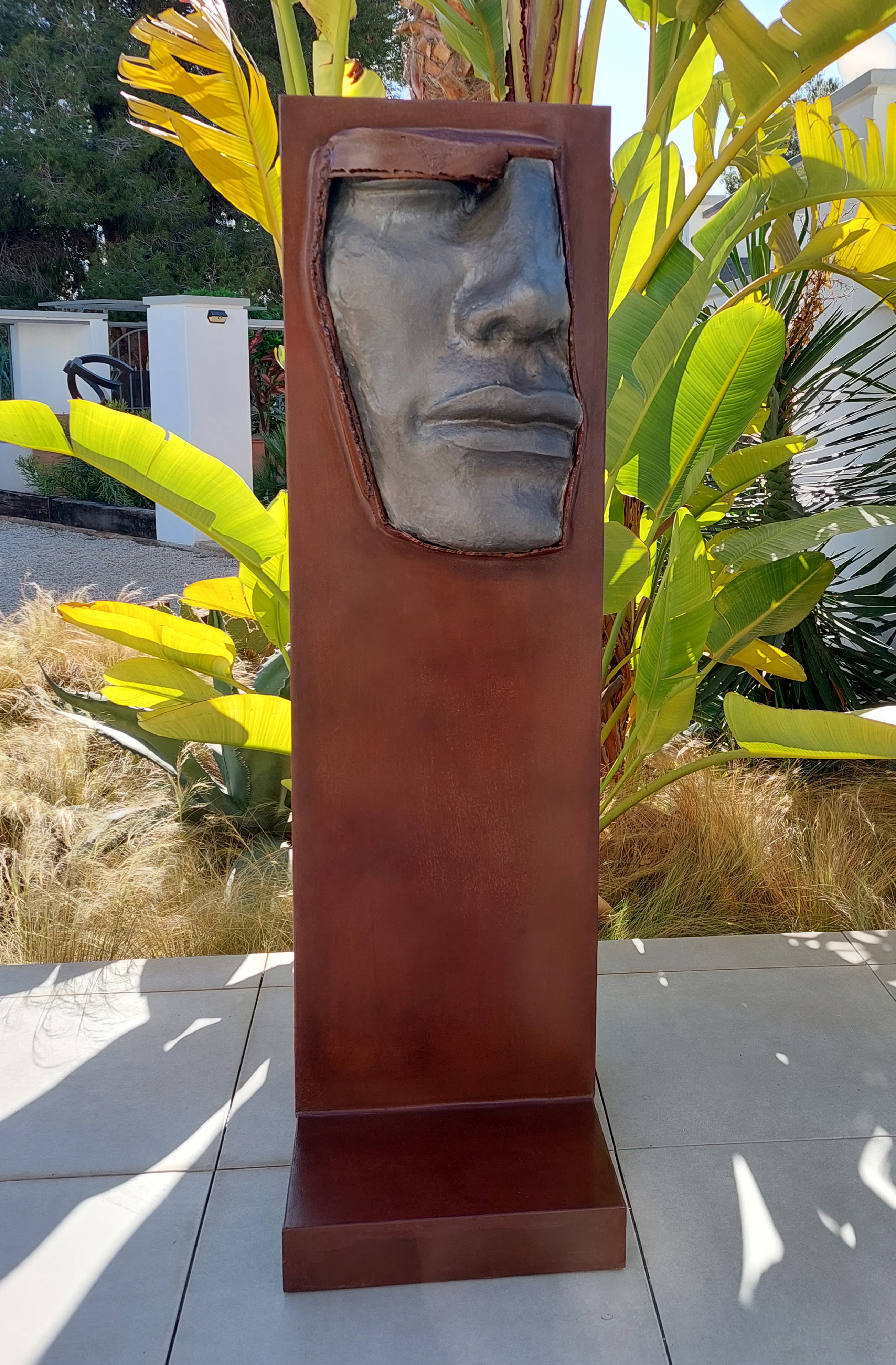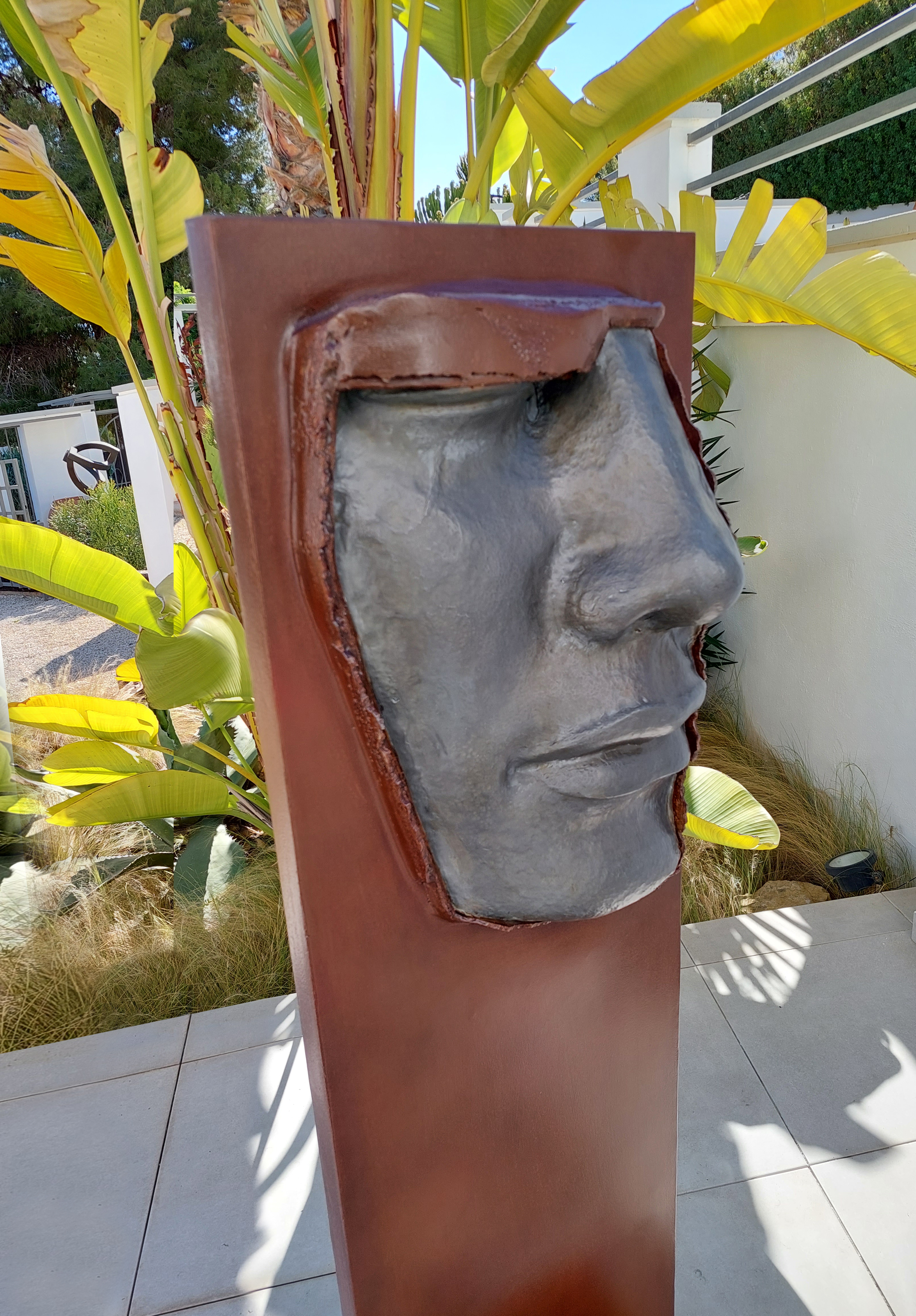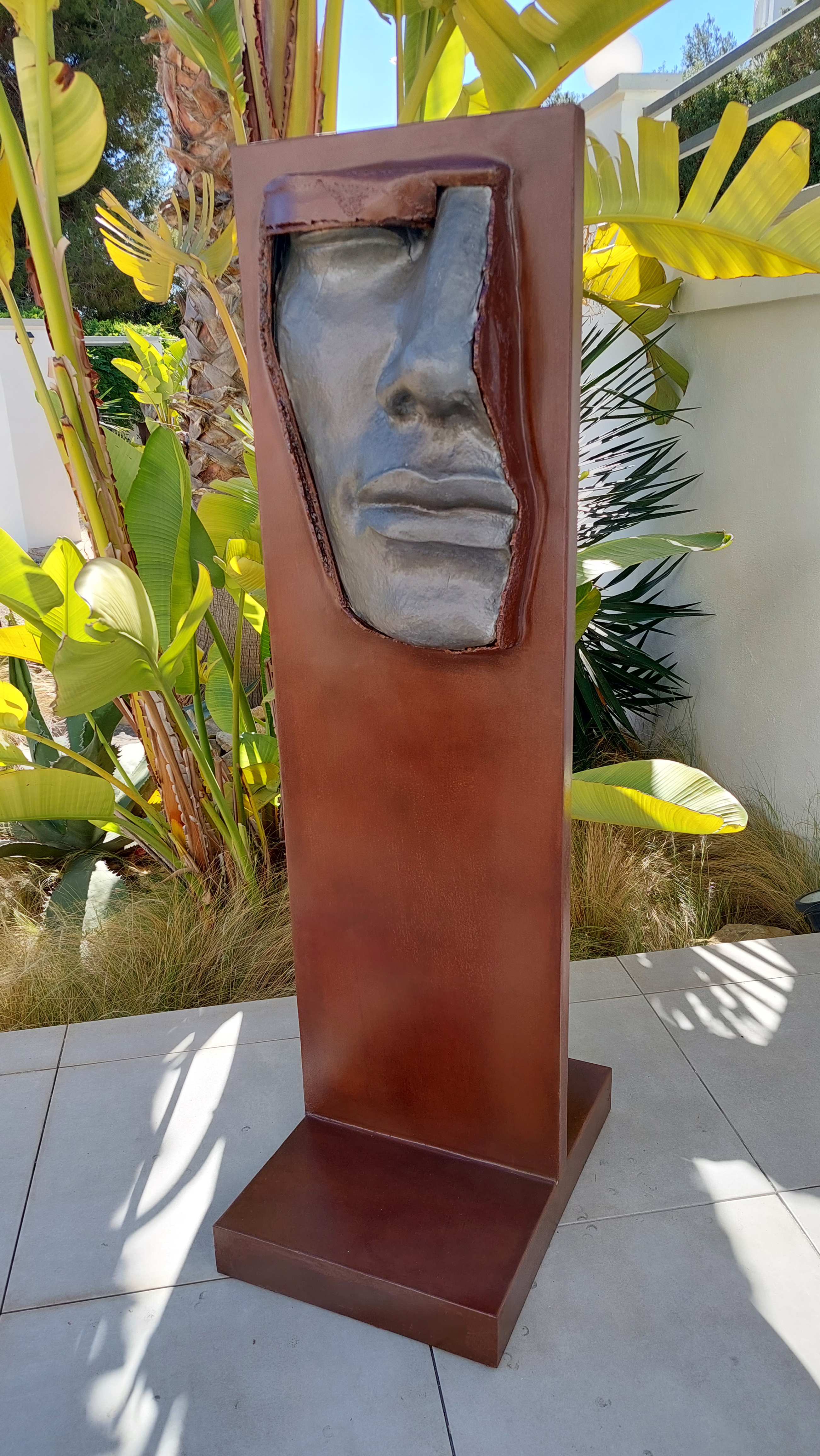 The lead alloy face is hand beaten into shape using traditional panel beating methods. This process is produced by many hours of manipulating metal over an anvil and steel shaping dollies by hammer. The face is supported by a corten steel structure complete with base.