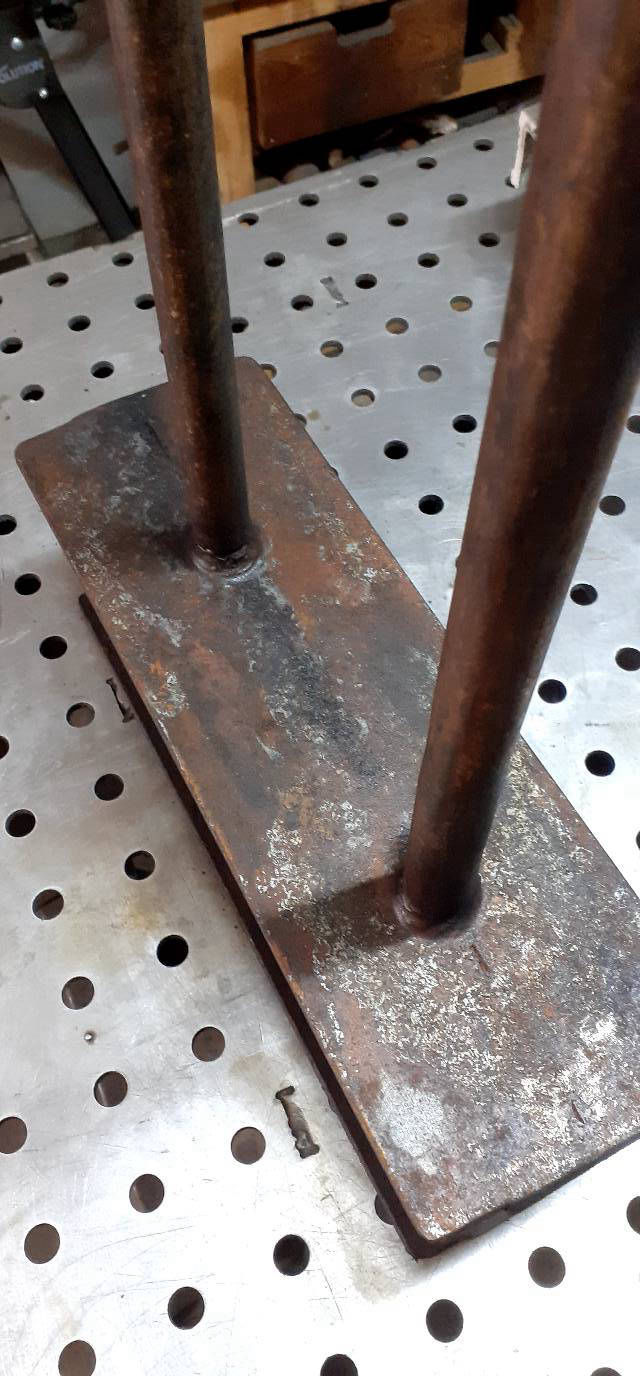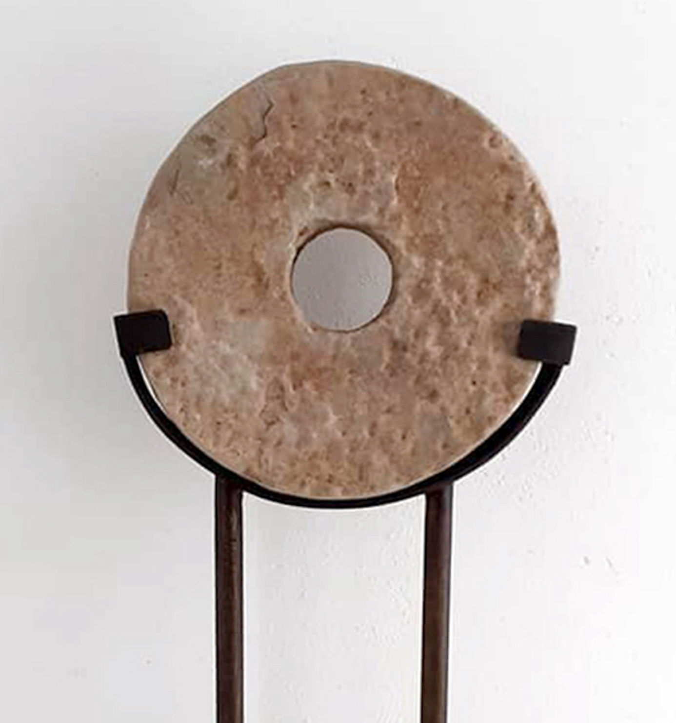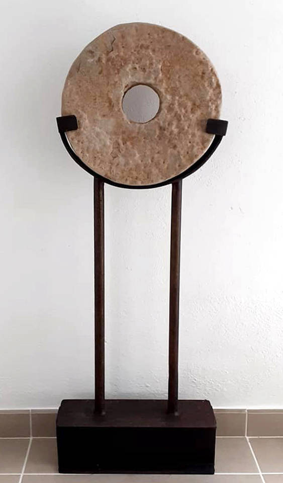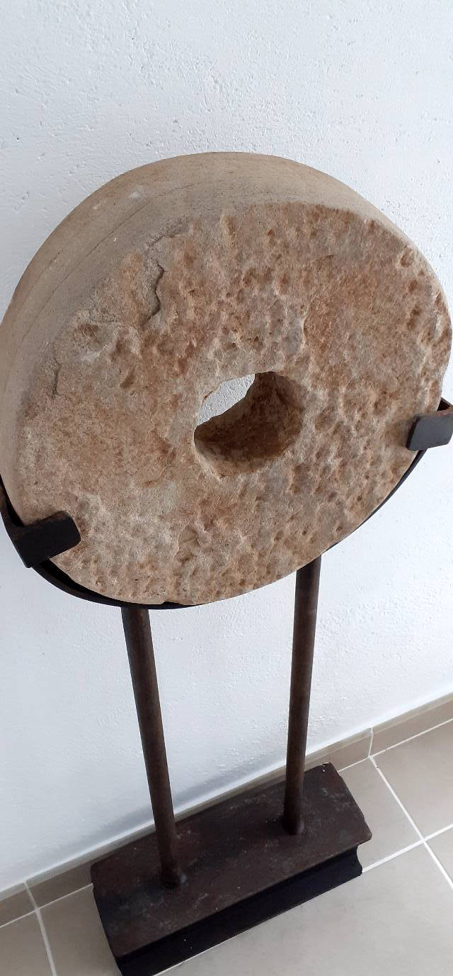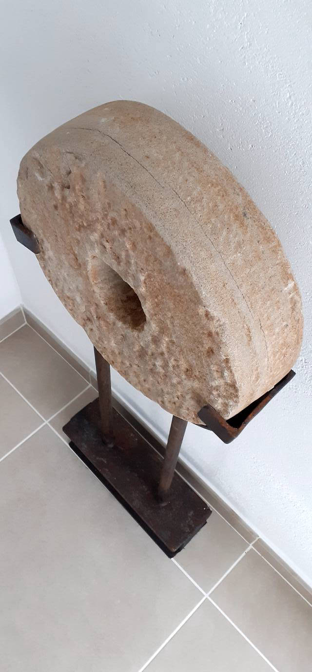 A Roman millstone on chemically aged heavy stand. Height 110cm, width 40cm.