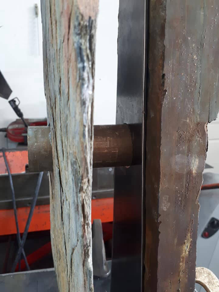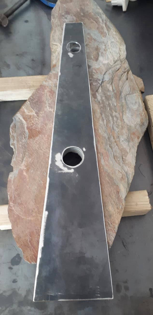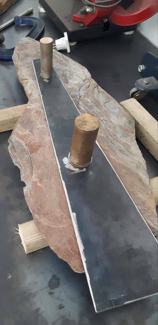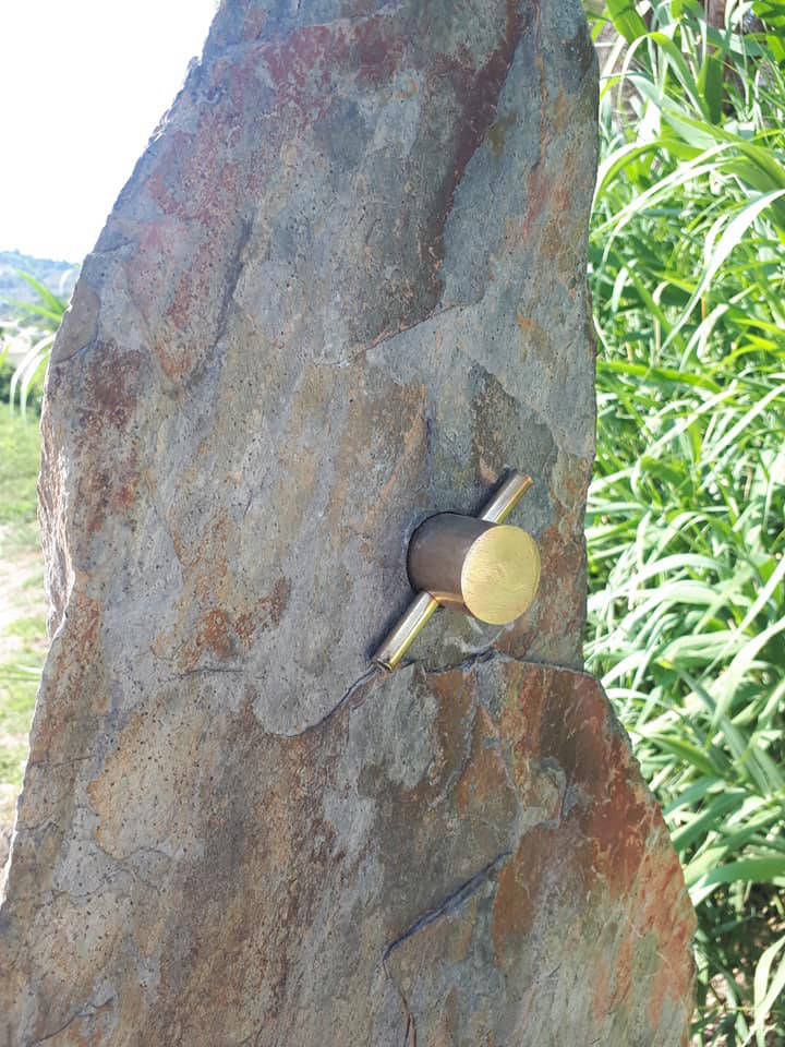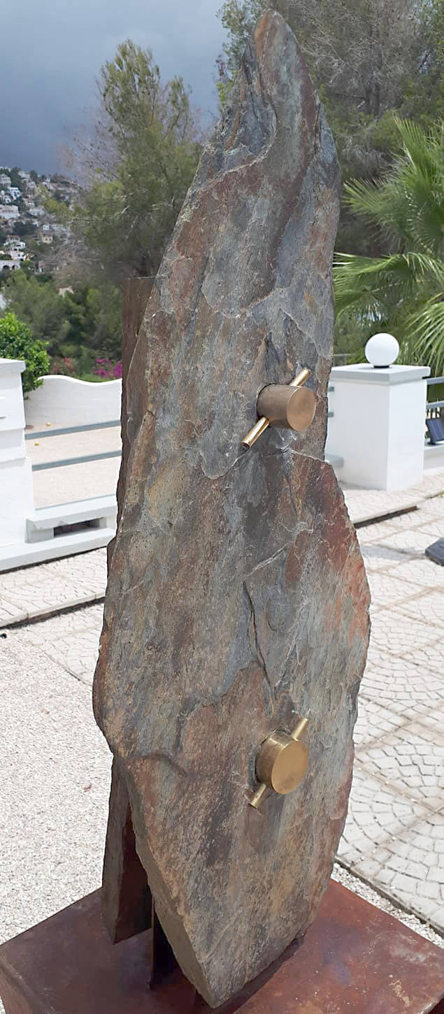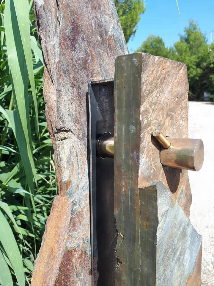 Garden sculpture standing 1.85m high. Steel plate, stone flanks, bronze rounds and pins