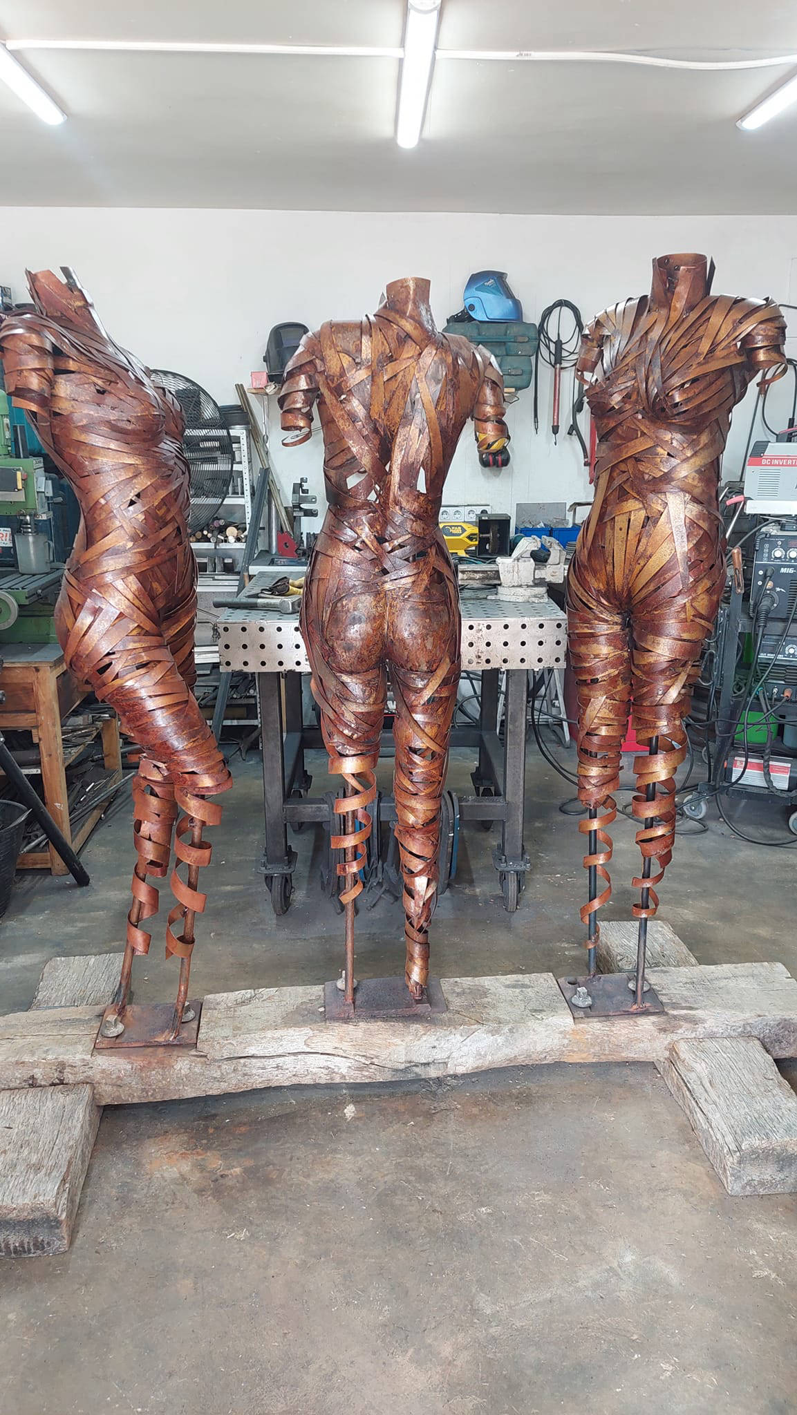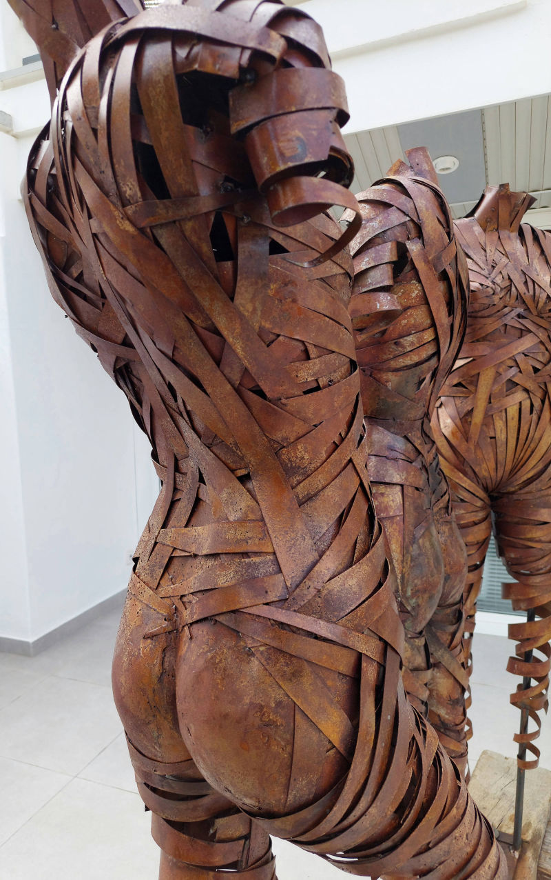 Life size steel forms with oxide patination. Mounted on a vintage railway sleeper with its original irons, complete with hand crafted cradles and wedges supporting the sleeper. Standing 1.85m tall x 2m wide.
